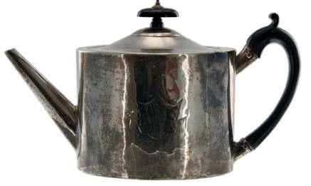 George III silver oval teapot, with engraved crest and hardwood handle and finial, maker Michael Plummer, London 1794, 6" high, 15oz t £150