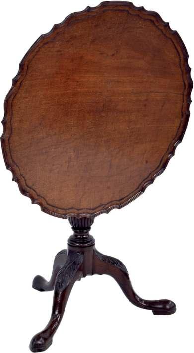 George III mahogany circular tripod table, the tilt-top with a piecrust border upon a turned and reeded column upon a tripod base carved with sheathed acanthus and terminating with pad feet, bearing a 'Spillman & Co, St Martin's Lane, London' trade label, 30" diameter, 28" high £200£300