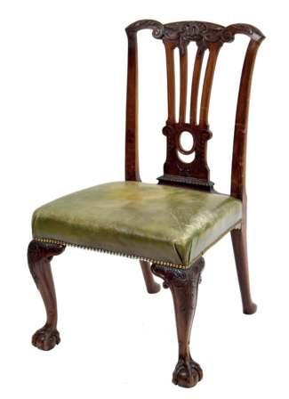 Fine George I walnut side chair, the curved top rail with a central shell motif above a bird head and scroll carved pierced vertical splat, drop-in tapestry seat and carved cabriole legs, 24" wide, 20" deep, the seat 19" high, the back 38" high £300£500