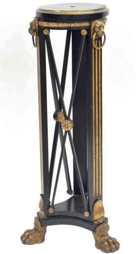 Fine Regency lacquered and gilt Xframe stool attributed to Thomas Hope (17691831), with gilt leopard's head terminals applied with brass rings and modern tassels, upon a sweeping xframe united with a central turned stretcher with downswept supports terminating with carved paw feet, button upholstered seat, 31" high, 35" wide, depth 19"
