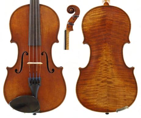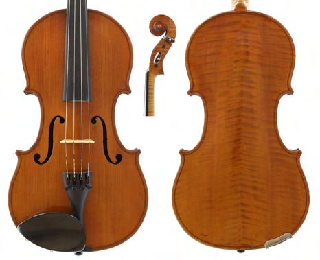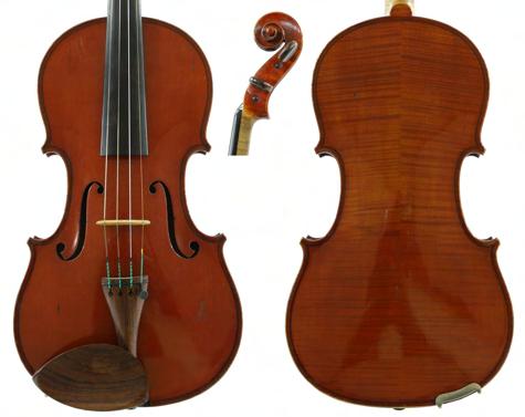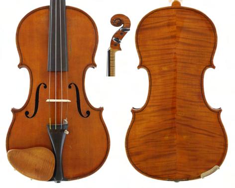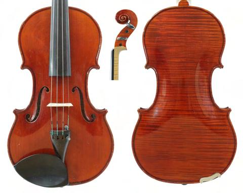 Good modern English violin by and labelled Martin J: Hilsden, Maker, Oxford, Anno 1986; also signed on the label and stamped M.J. Hilsden above the label, the two piece back of fine curl with similar wood to the sides and head, the table of a fine width grain slightly widening to the flanks and the varnish of a golden-brown colour, 14", 35.60cm, case