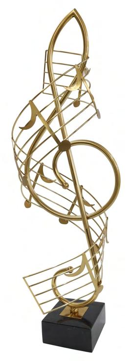 Decorative musical metal sculpture, a treble clef within a spiral musical stave, mounted upon a square polished stone plinth, 27" high