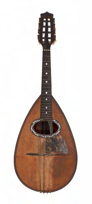 Good and rare Guarnierius Receveur four string tenor banjo circa 1930, the wooden back inlaid with a geometric mother of pearl circular design, with 8.5" skin and geometric mother of pearl inlay to the fretboard and open peg box inscribed Guarnierius Luthier, case