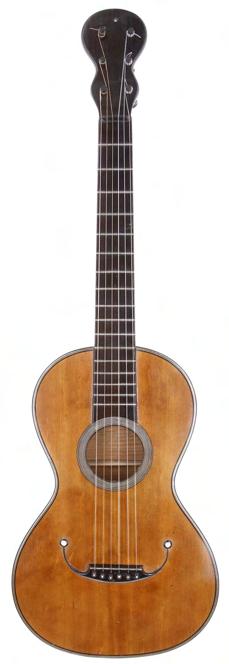 Harald Petersen concert guitar; Back and sides: figured maple, a few minor marks otherwise very good for age; Top: cedar, minor hairline split to the upper bout to bass hand side of fretboard, minor play wear, minor rippling visible behind bridge; Neck: mahogany; Fretboard: ebony; Frets: good, refret; Hardware: original tuners, bridge plate with some lift to edges, replacement saddle; Case: Hiscox hard case; Overall condition: good for age