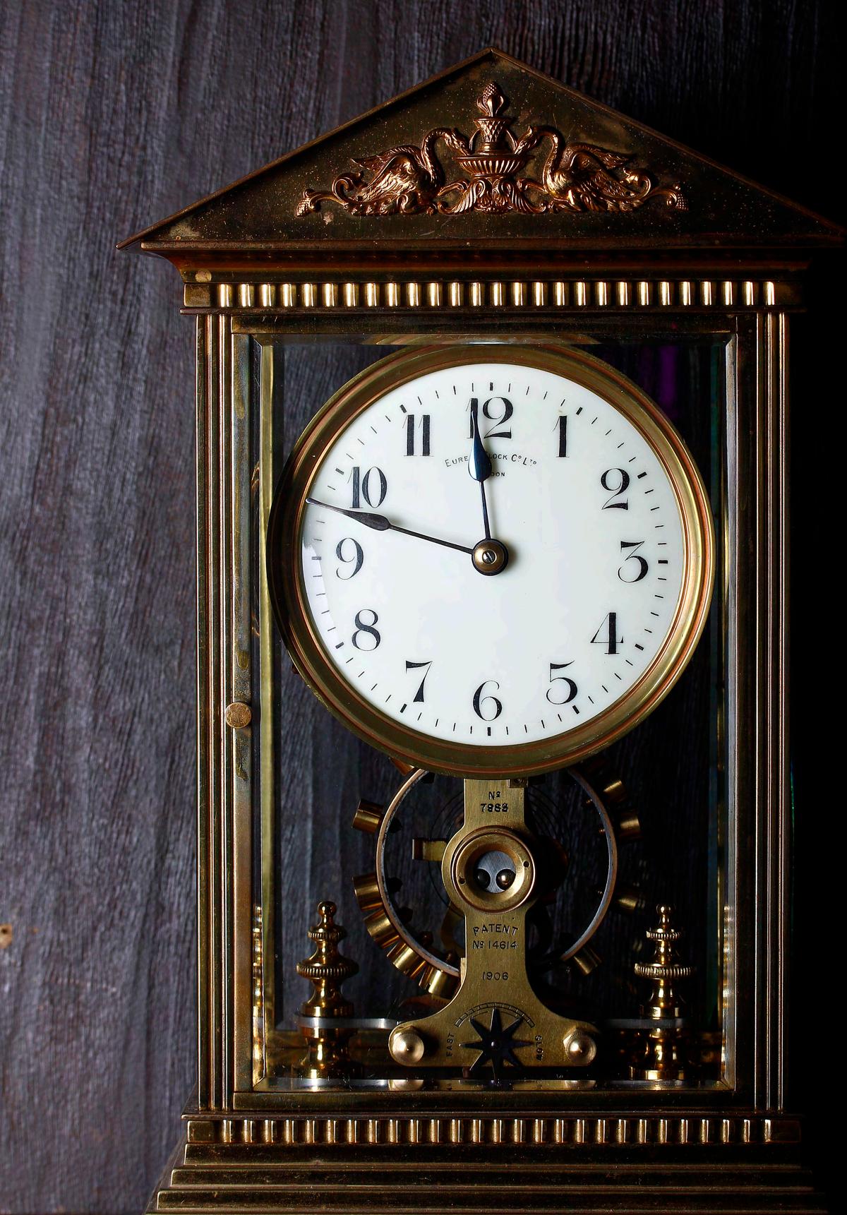 Good Aesthetic ormolu pocket watch stand with calendar, with three supports over a carnelian oval bowl, the graduated engraved foliate base with revolving month and date apertures, 7" high