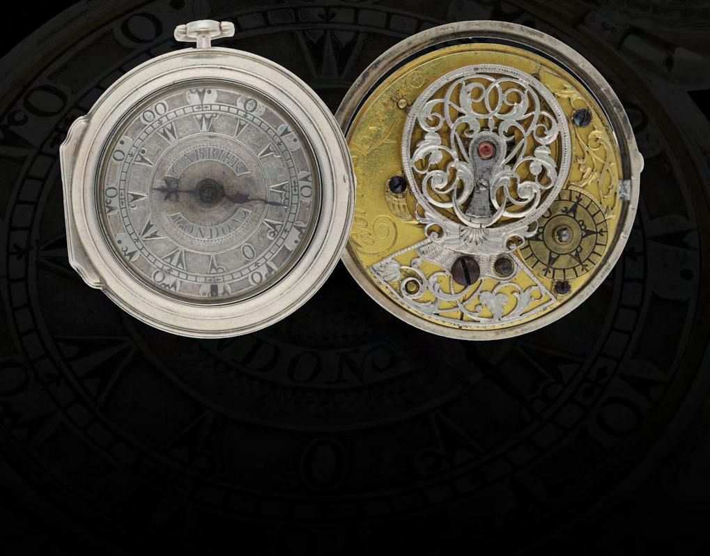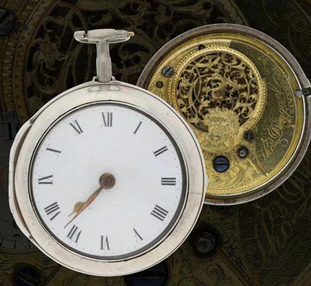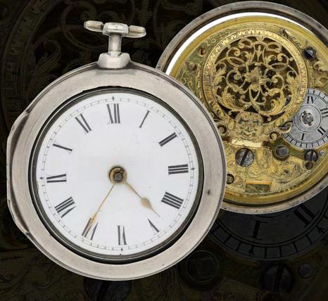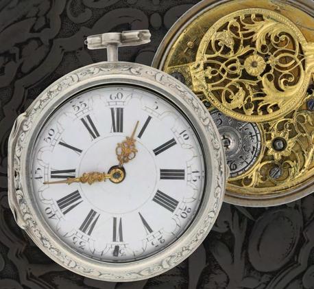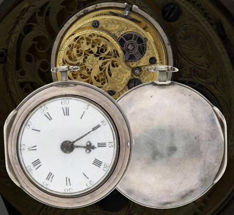 5. Massy, London - English early 18th century silver pair cased verge pocket watch, circa 1705, signed deep plate fusee movement, with three-arm sprung flat steel balance, finely pierced and engraved winged balance cock with conforming broad foot, silvered regulating dial and Egyptian pillars, signed champlevé dial with a repoussé centre, with Roman numerals and outer Arabic five minute chapter, steel hands, plain cases, the inner case with maker's stamp 'MF', 60mm