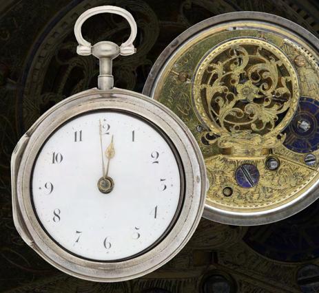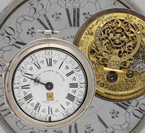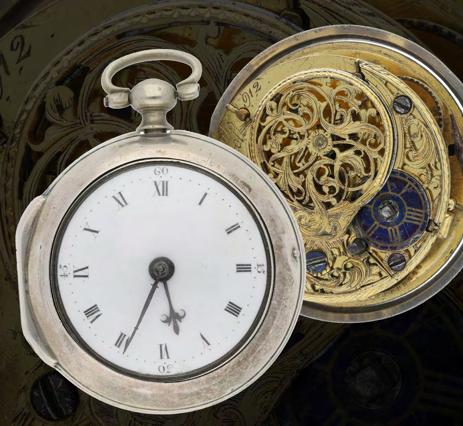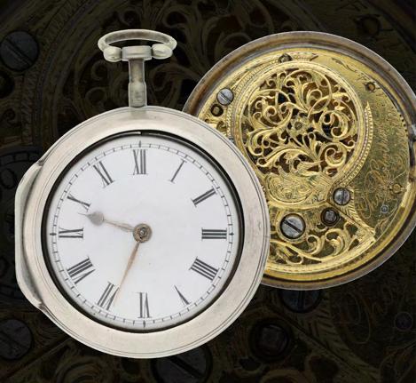 Cabrier, London - English 18th century silver and gilt metal quarter repeating pair case verge pocket watch, signed fusee movement with plunge repeat, sprung three-arm flat steel balance, pierced foliate balance cock and strapwork foot, gilt regulating disc and square baluster pillars, with hammers striking a bell to the inner case, enamel white dial with Roman numerals and outer Arabic minute chapter, gilt spade hands, pierced and engraved inner case, finely re-gilded repoussé and pierced outer case depicting figures and a cupid within scroll designs, 51mm (the repeat function requires adjustment - see report)