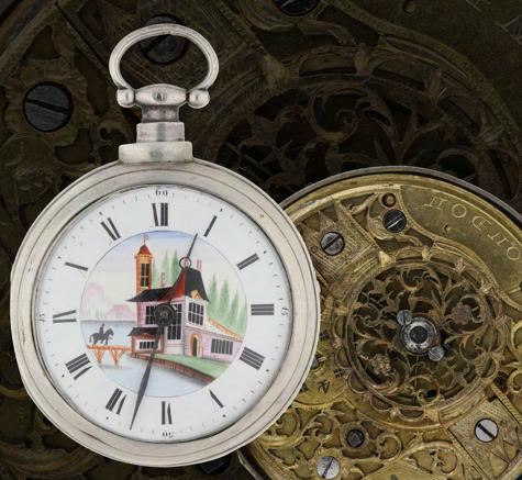 Masonic Interest - late George III silver pair cased verge pocket watch, Birmingham 1815, unsigned fusee movement with sprung three-arm flat steel balance, pierced engraved balance cock and cylindrical pillars, rare polychrome painted dial with Masonic emblems, Arabic numerals and outer minute markers, spade hands, matching plain cases, the outer case with engraved initials, 56mm £300-500