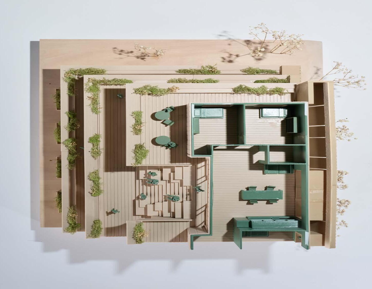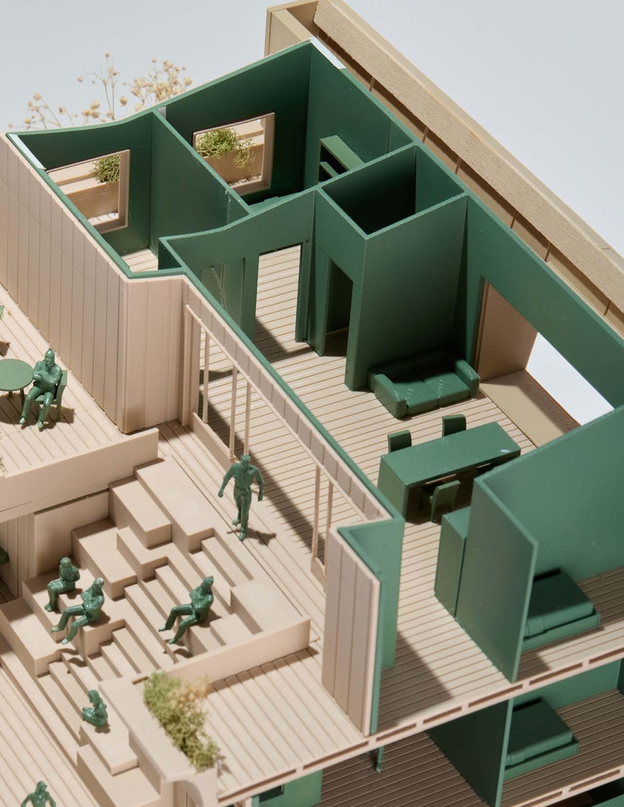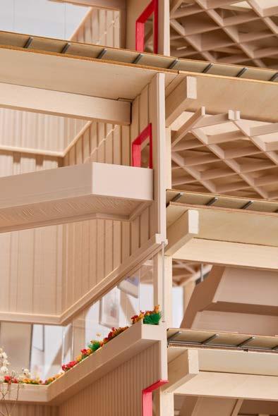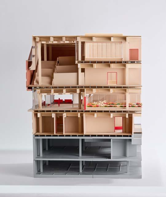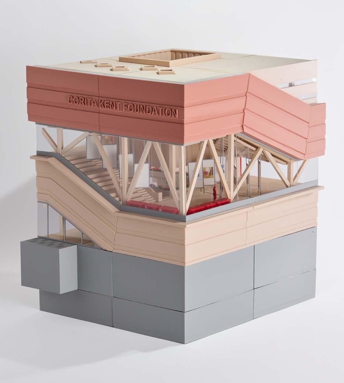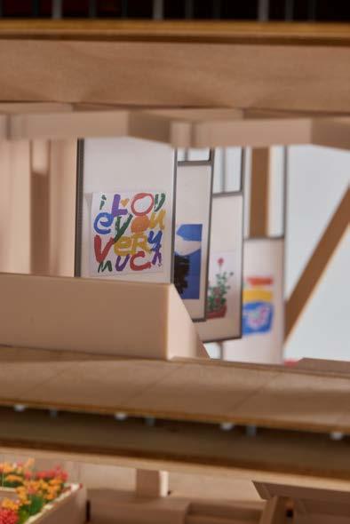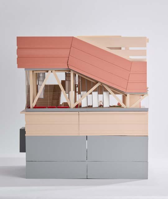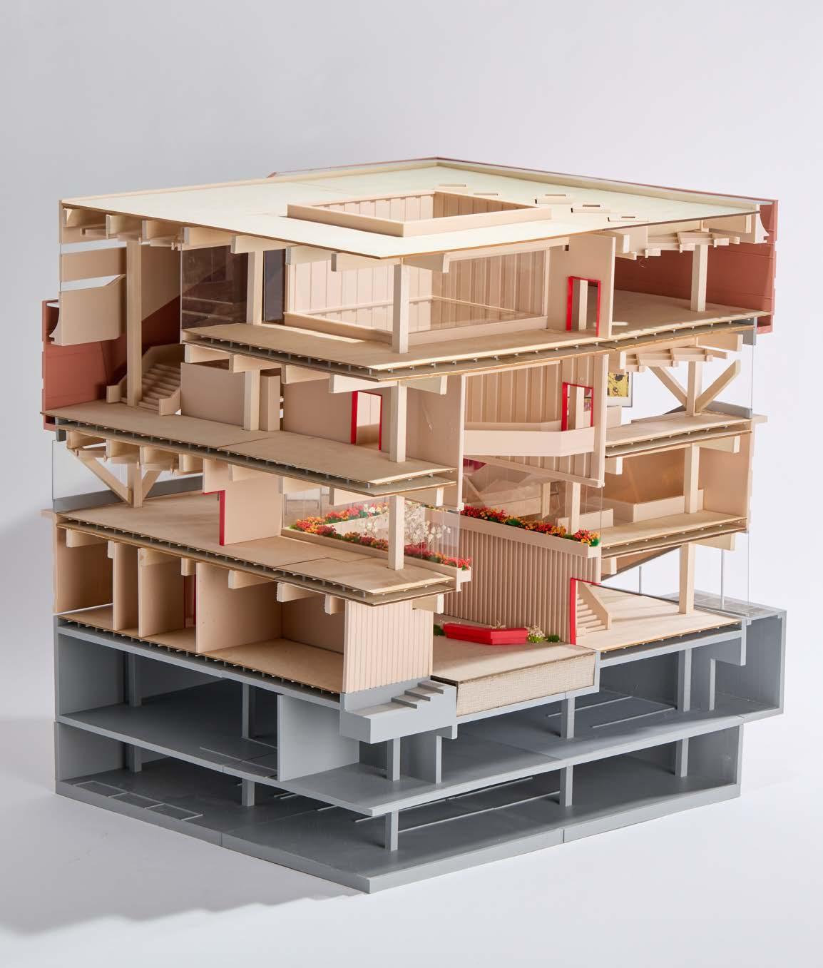 1/4” = 1’-0” chunk model constructed from basswood and 3D printed components, the chunk model exhibits the sectional relationship of the gallery, community, and research spaces, while showing the structural makeup of the building.
