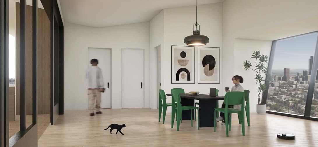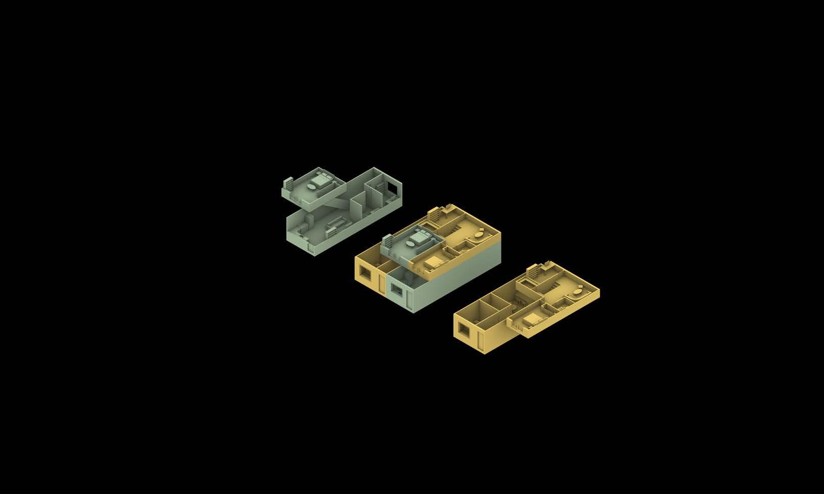 5 primary unit types were developed in order to accomodate a wide variety of household sizes and lifestyles. The lower floors consist of a 2 bedroom and 3 bedroom arrangement, interlocked into a single package, allowing for access to light at both the front and back of each unit. The upper levels consist of a spread of 1 bedroom and studio units that accomodate varying levels of co-living lifestyles, with smaller units having closer proximity to shared work and living spaces.