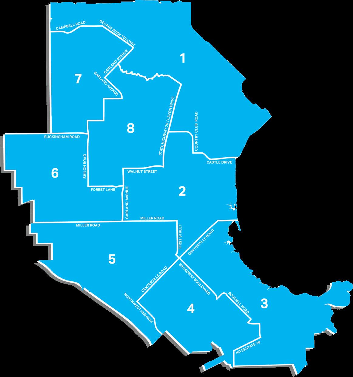 Kris Beard 214-418-9461 Council2@GarlandTX.gov DISTRICT 2 Ed Moore 214-243-3053 Council3@GarlandTX.gov DISTRICT 3 B.J. Williams 972-898-7672 Council4@GarlandTX.gov DISTRICT 4 Margaret Lucht 469-264-3556 Council5@GarlandTX.gov DISTRICT 5 Carissa Dutton 972-998-8542 Council6@GarlandTX.gov DISTRICT 6 Dylan Hedrick 469-560-6099 Council7@GarlandTX.gov DISTRICT 7 Chris Ott 972-987-9149 Council8@GarlandTX.gov DISTRICT 8