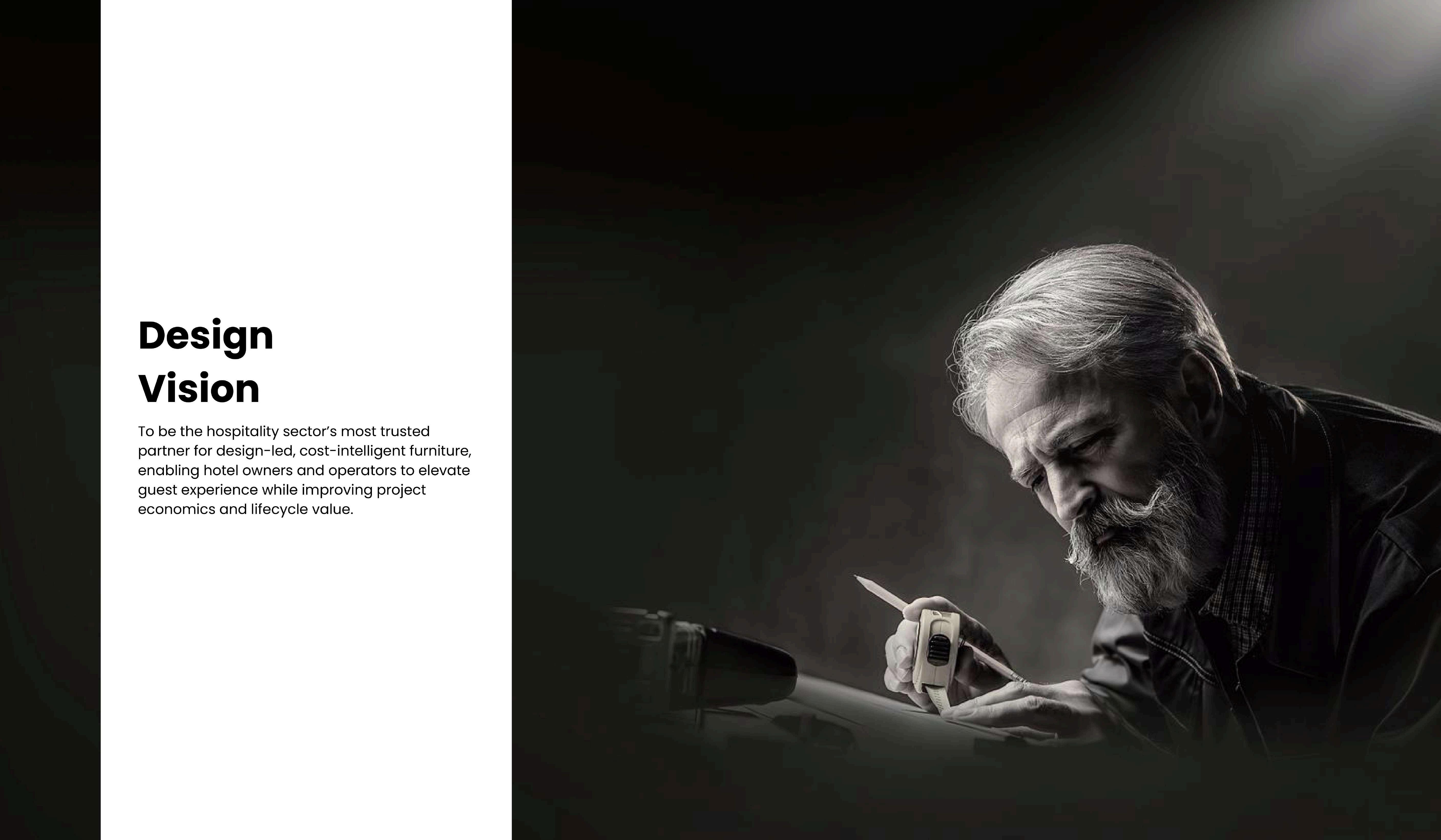 Tobethehospitalitysector’smosttrusted partnerfordesign-led,cost-intelligent furniture,enablinghotelownersand operatorstoelevateguestexperiencewhile improvingprojecteconomicsandlifecycle value.