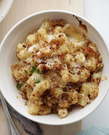 STEP 5: Stir cooked macaroni into cheese mixture. Fold in beaten egg whites. Spoon mac and cheese into prepared bowls. Top with Garlic Bread Crumbs.