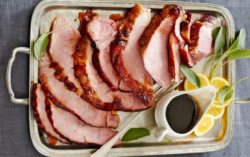STEP 4: Brush ham with some of the glaze during the last 20 minutes of baking. If desired, garnish with lemon slices and sage. Serve with the remaining glaze.