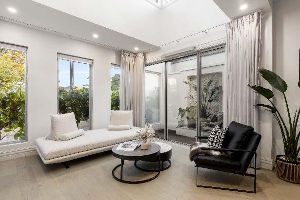 The elegant surrounds of this prestigious boutique block of only five by Megowan Architects are the perfect prelude to this very private & utterly unique residence. With its own secure entrance, illuminated open plan single level living defies expectations with a new wave in chic style, the latest in high quality fixtures & a generous entertainer’s garden. The impeccable interior features light engineered oak floorboards, matching shelving & black fittings for a complete point of difference. Voluminous living & dining are awash with glorious northern light complementing an easeful flow though sliding doors revealing a
