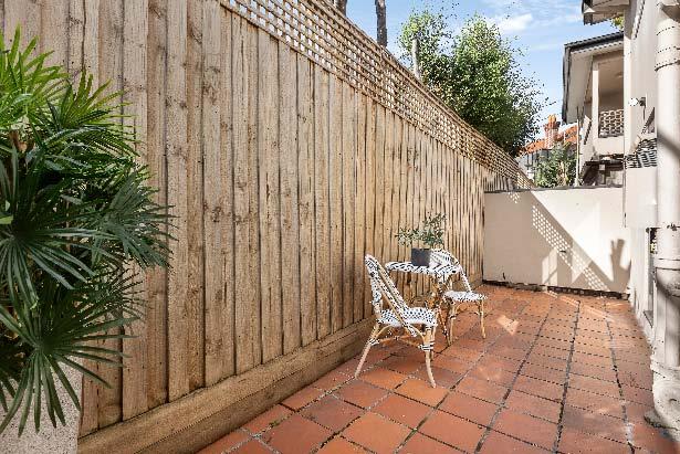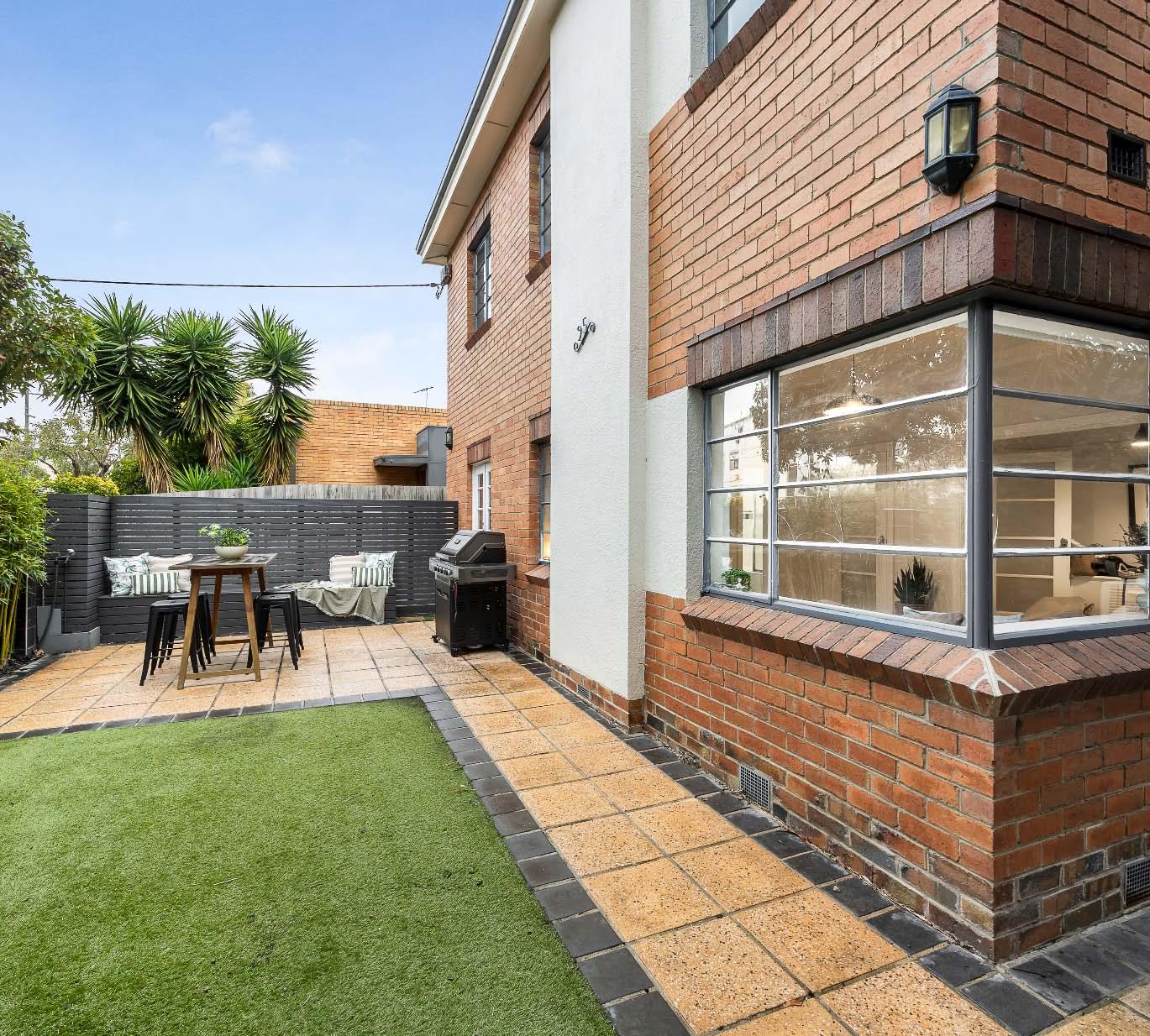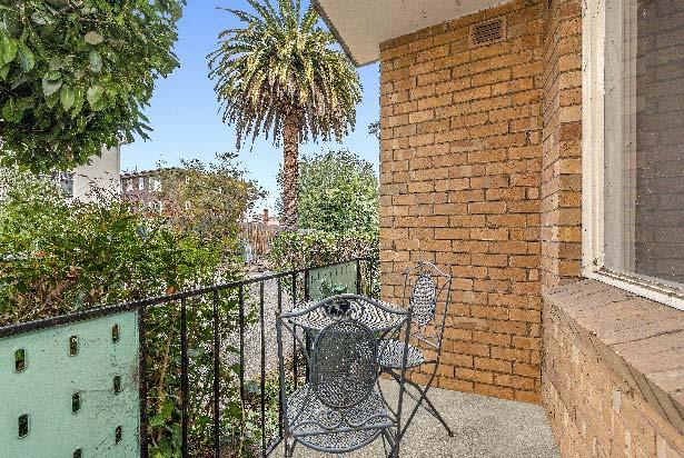grass, established plants & banquette seating for entertaining at its best. Two huge bedrooms are complemented by built-in wardrobes, the main with garden views, furthered by an immaculate in-theme bathroom with a shower-over bath, heat lamp & original freestanding sink. Your own entrance, a split system, car space, intercom & off-street parking complete this unique unit sized apartment set in a super solid boutique block with an incredible palm tree lined entrance moments from transport & shopping strips.