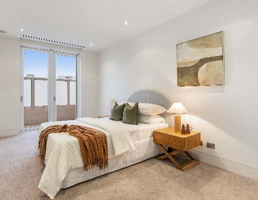 living & dining extends through bi-fold doors to an expansive outdoor terrace. The state-of-theart stone kitchen showcases a striking oversized waterfall-edge island bench/breakfast bar, an abundance of storage & a suite of premium Miele appliances. Away from the living zone a main bedroom with a walkway of built-in robes & luxe marble ensuite, a second bedroom with built-in robes & a third bedroom or optional custom fitted study/home office with balcony access. Other features include a central bathroom, zoned ducted heating/cooling, alarm, secure basement parking for two cars plus storage room.