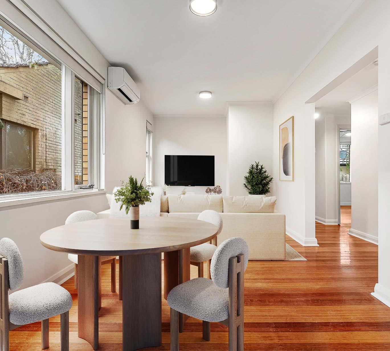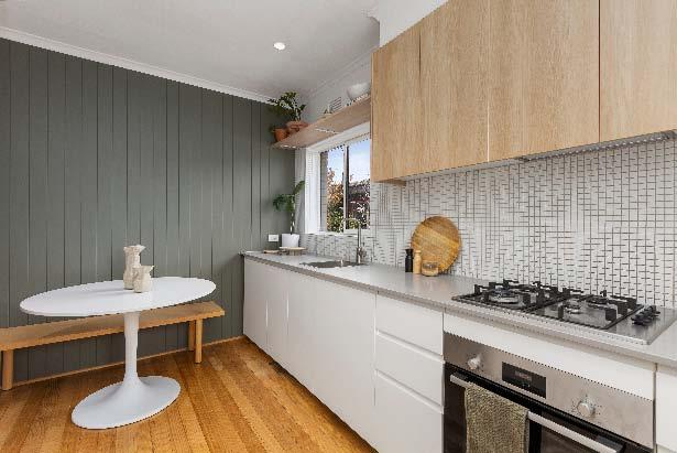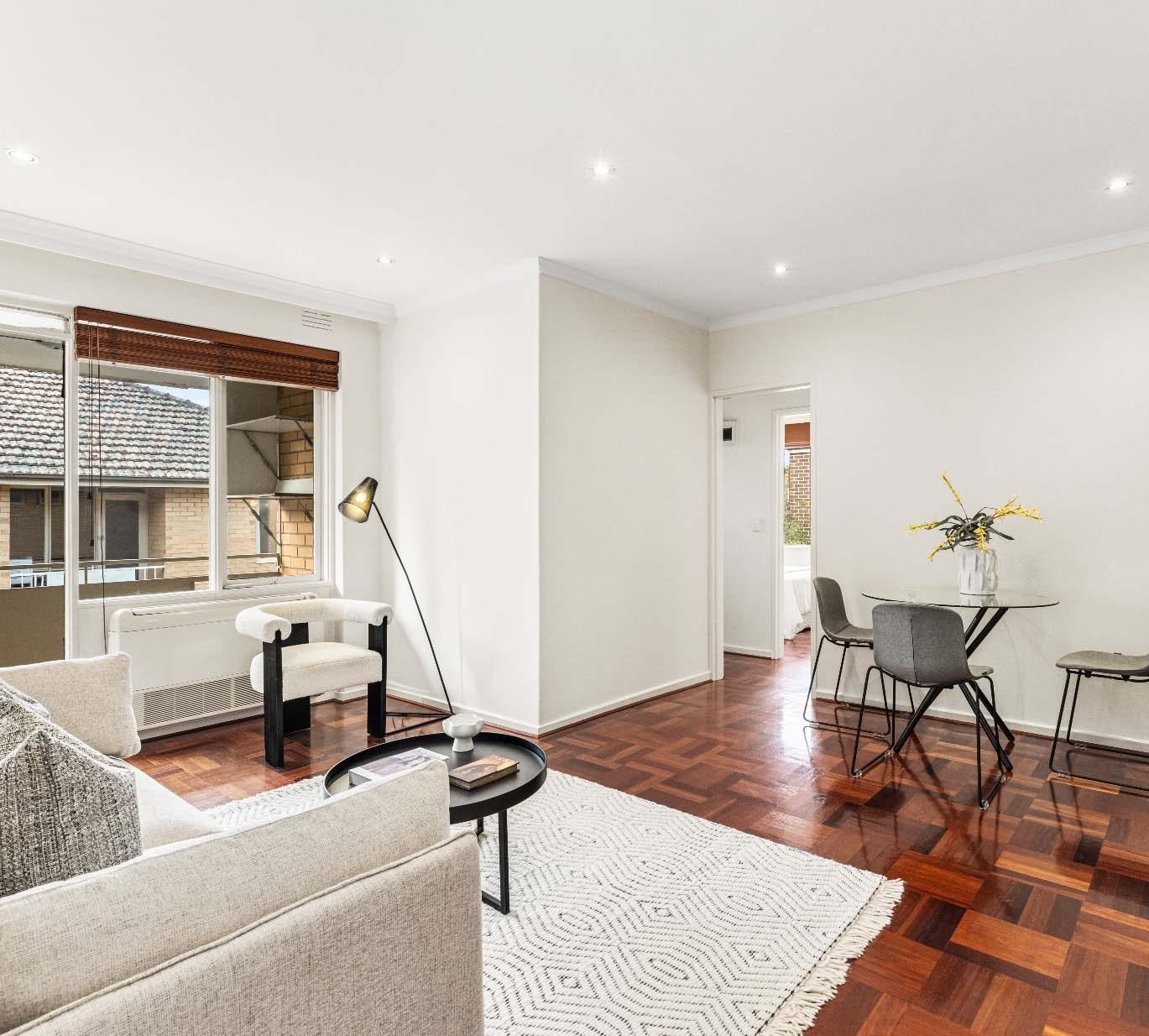 Renovated from top to toe, this light-filled apartment blends designer style with timeless natural tones, creating a space that feels both modern & inviting. Hardwood floors flow through the open-plan living, complemented by a dedicated dining area & a sleek kitchen featuring stone benchtops, Bosch oven, gas cooktop & integrated dishwasher. Two generous bedrooms with built-in robes enjoy calming, leafy outlooks, while the chic bathroom impresses with floorto-ceiling tiles. Internal laundry facilities & split-system heating/cooling add everyday ease. Privately positioned at the rear of a boutique block