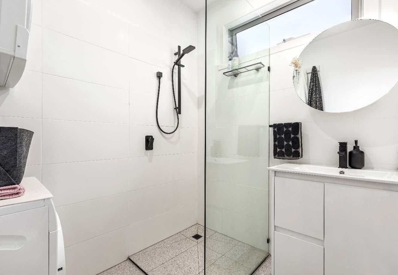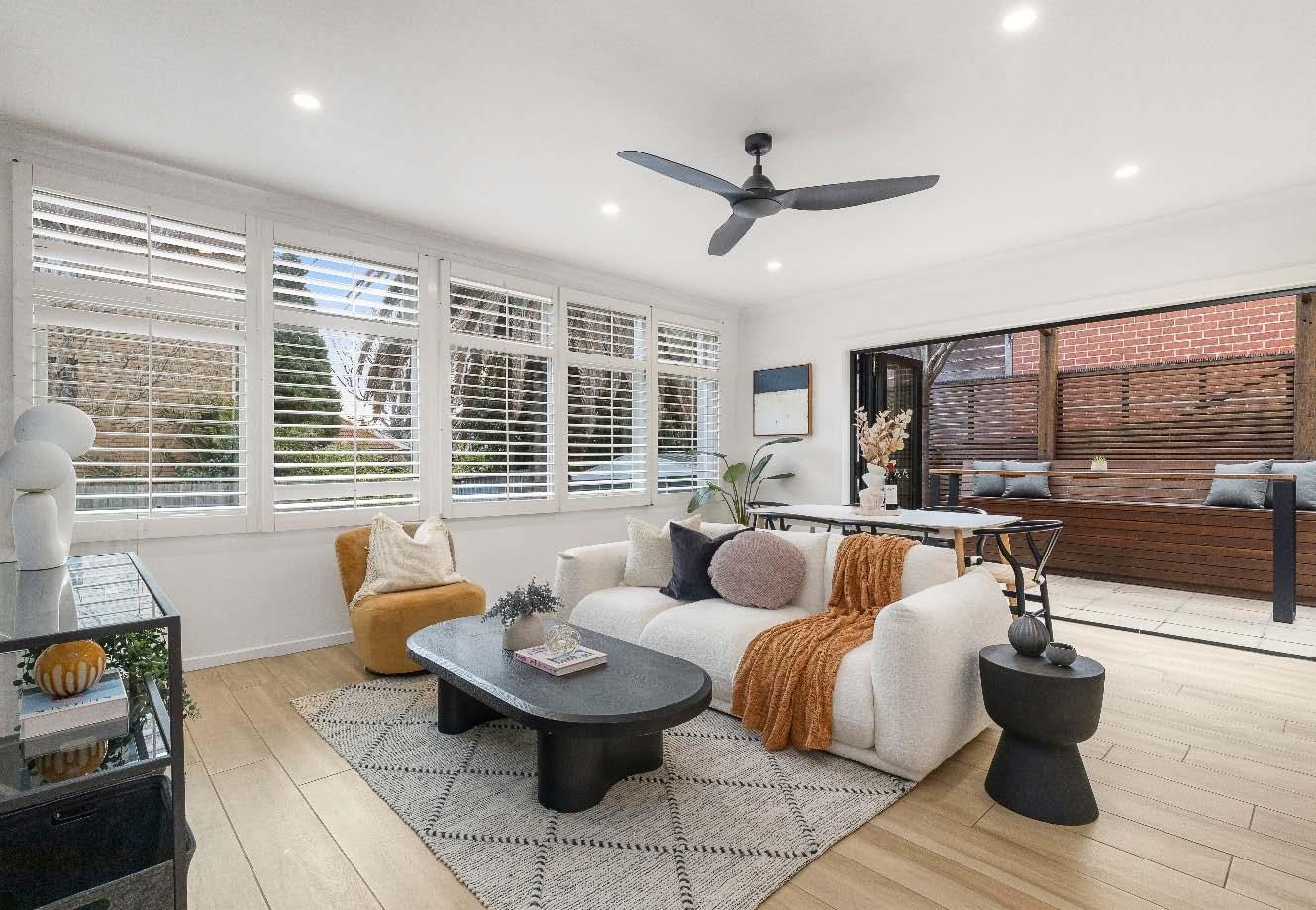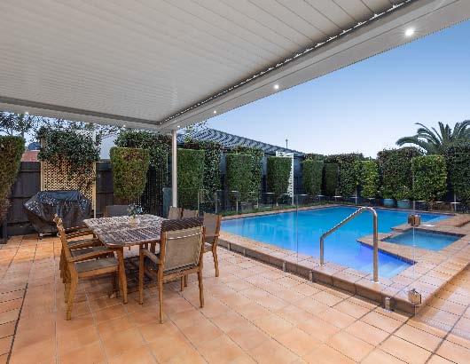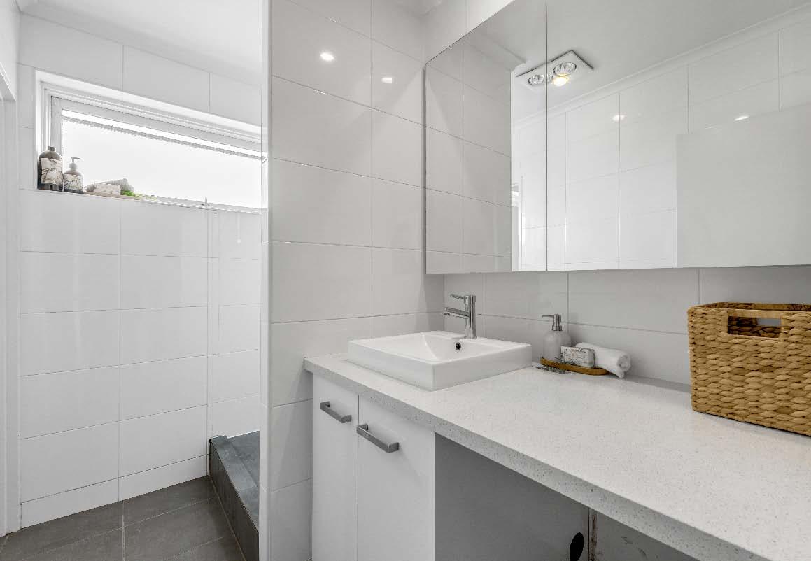 & stone benchtops, while the open-plan living & dining area is filled with natural light & excellent airflow. Concertina double- glazed windows & doors open out to a sunny deck, creating a seamless indoor-outdoor connection. The main bathroom exudes luxury with a separate bath & shower & there’s also a fitted laundry with powder room, under-stair storage & a hallway linen press. Additional features include ducted heating & cooling, plantation shutters throughout, a northfacing private courtyard with built-in seating & a plumbed BBQ, plus an adjacent off-street car space & a separate storage shed.