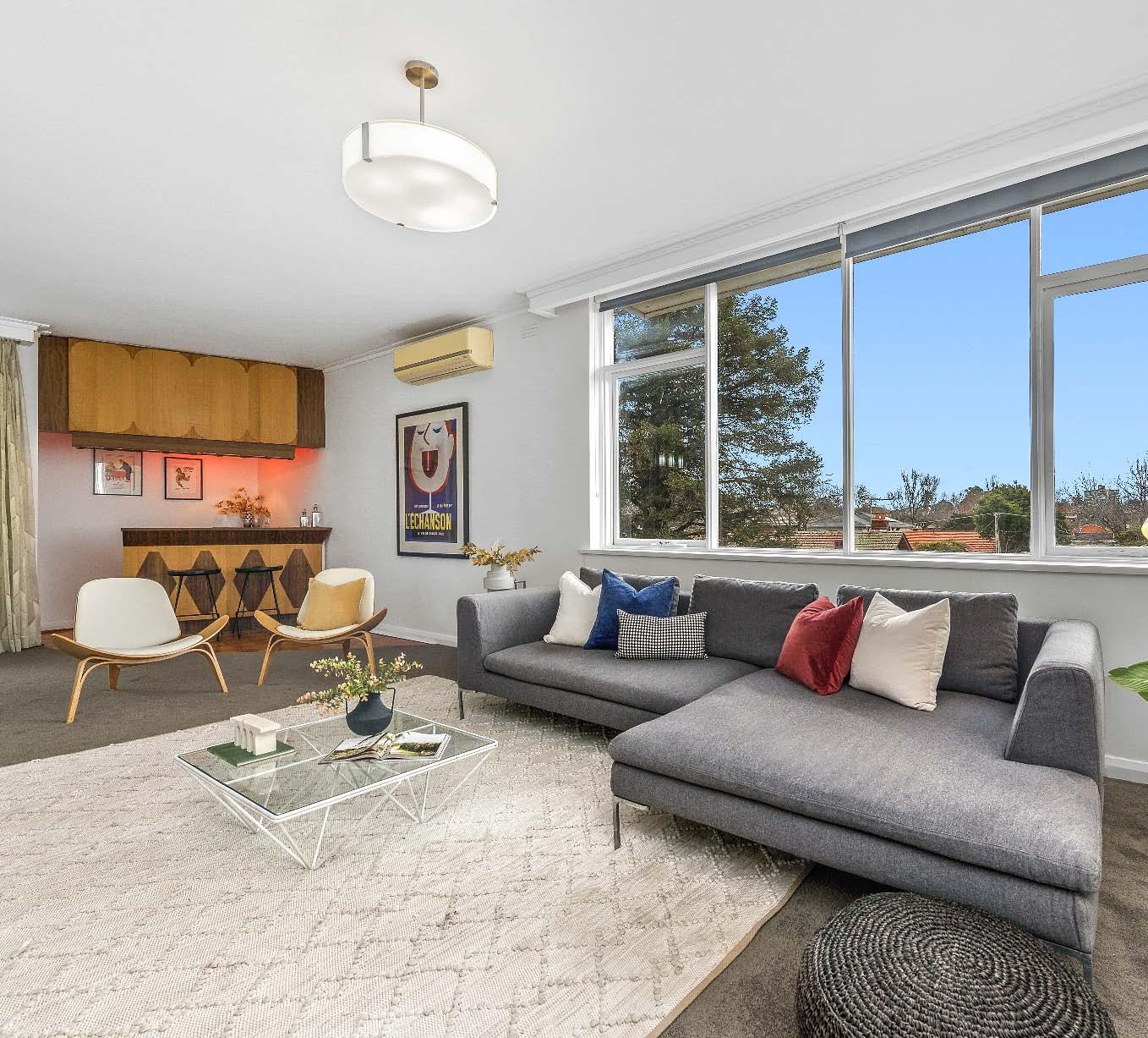 Instantly appealing for its sought after St Kilda East location, this solid 60’s apartment with house sized proportions, abundant natural light & a classic retro vibe is guaranteed to wow! One of just five in a tightly held, securely located Mid Century block, this immaculately presented, freshly painted & newly carpeted apartment is a rare find. This elevated residence instantly impresses with hardwood timber floors & flows through to a vast, sun-drenched L-shaped living & dining room, complete with a funky built-in entertainer’s bar & private balcony with panoramic views sweeping as far as the Bay. The spacious