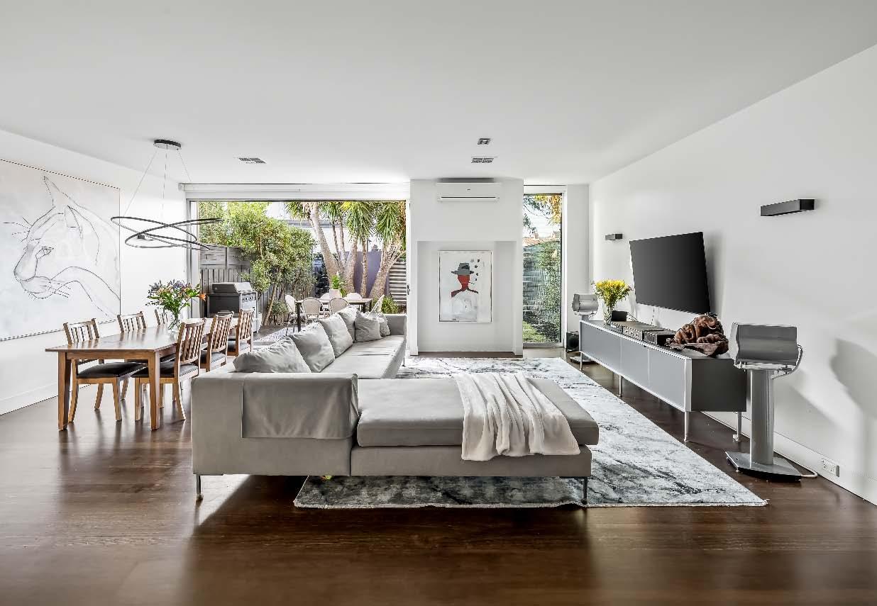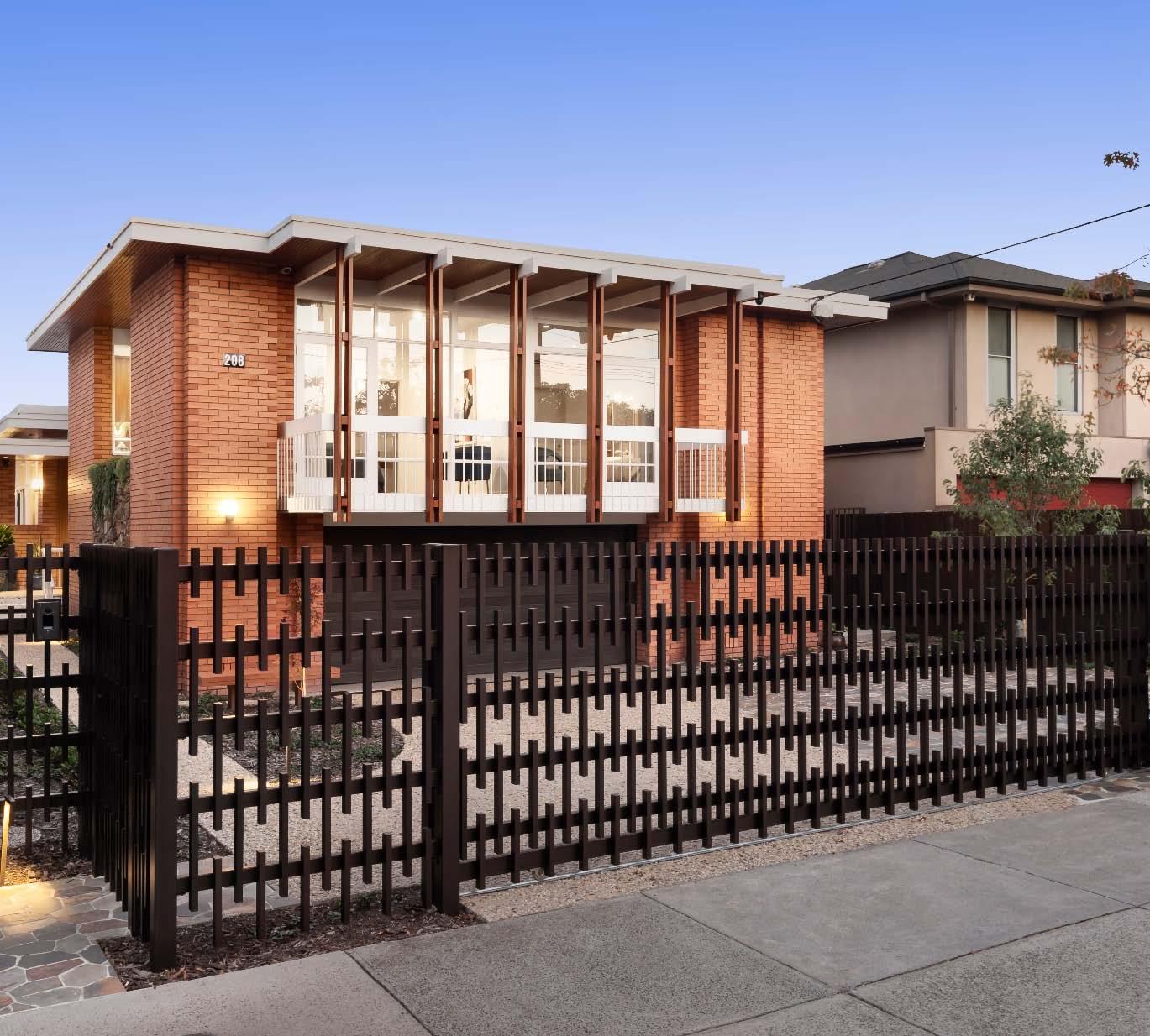 a stone-wrapped island. Bathrooms are appointed with floor-to-ceiling porcelain tiles & concealed cisterns, while sleek 2-Pack cabinetry conceals storage, a study nook & lift access. Finished with fine oak flooring, plush carpets, sheer curtains & plantation shutters, the home is climate-controlled across multiple zones, secured by video intercom & includes a soundproofed ‘garage band’ studio in the basement. Wrapped in Jack Merlo’s signature low-maintenance gardens, this exceptional residence is just a short walk to retail, rail, Dendy Park & minutes from Brighton’s beachside lifestyle.