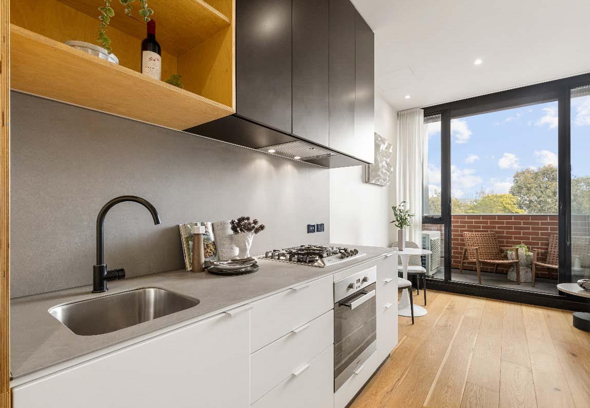 appliances, sleek splashbacks & abundant softclose cabinetry. Accommodation includes a main bedroom with space for a study nook, a walkway of built-in robes & a luxe ensuite, plus a second bedroom with built-in robes & balcony access, complemented by a fully tiled central bathroom. Additional highlights include split-system heating/ cooling, video intercom entry, secure basement parking for one car, a Euro laundry & lift access. Ideally positioned in a sought-after court within the coveted McKinnon Primary & Secondary College zones & just moments from shops, cafés, parklands & McKinnon train station.