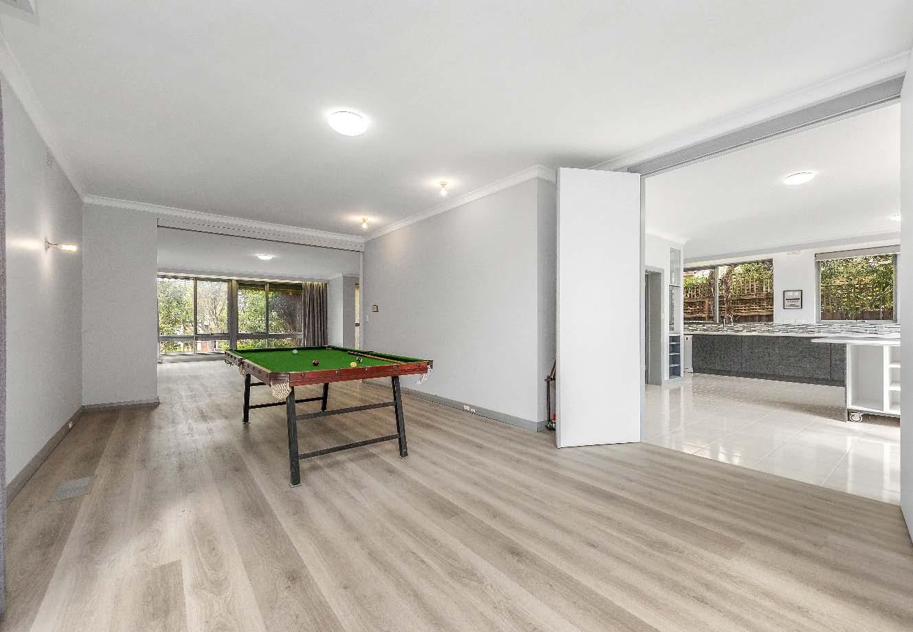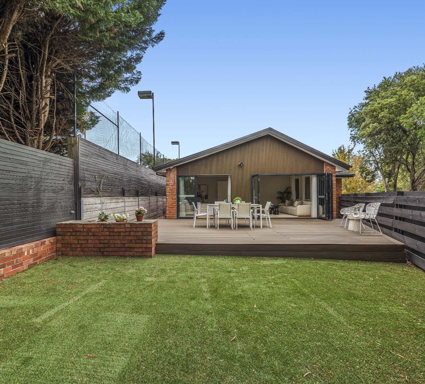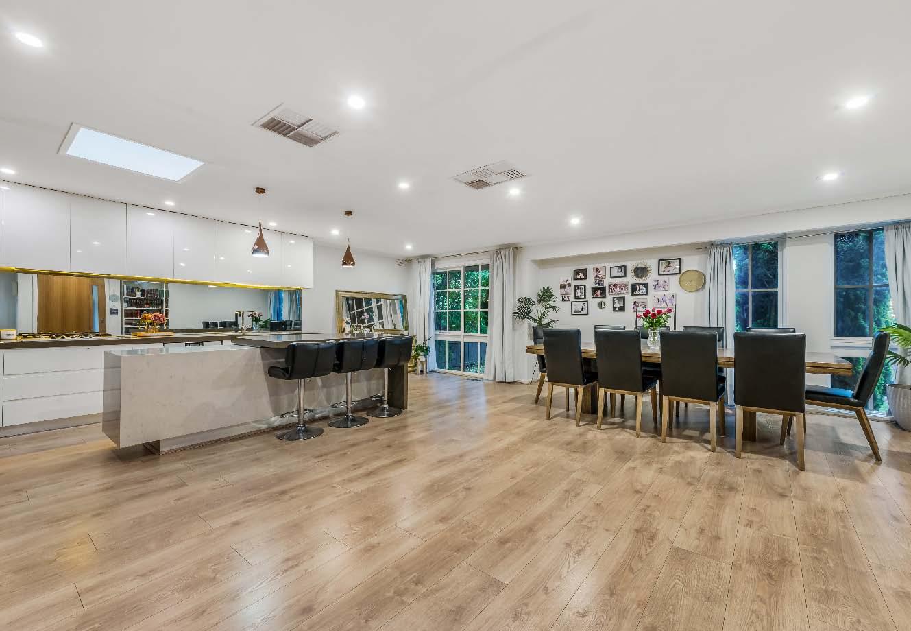 A living & dining connects seamlessly to the alfresco via two sets of glass French doors, revealing an expansive wrap-around deck with an entertainer’s dining zone & sunny northern aspect.
