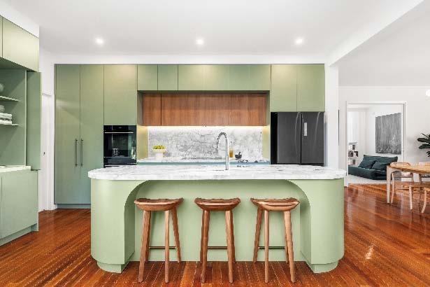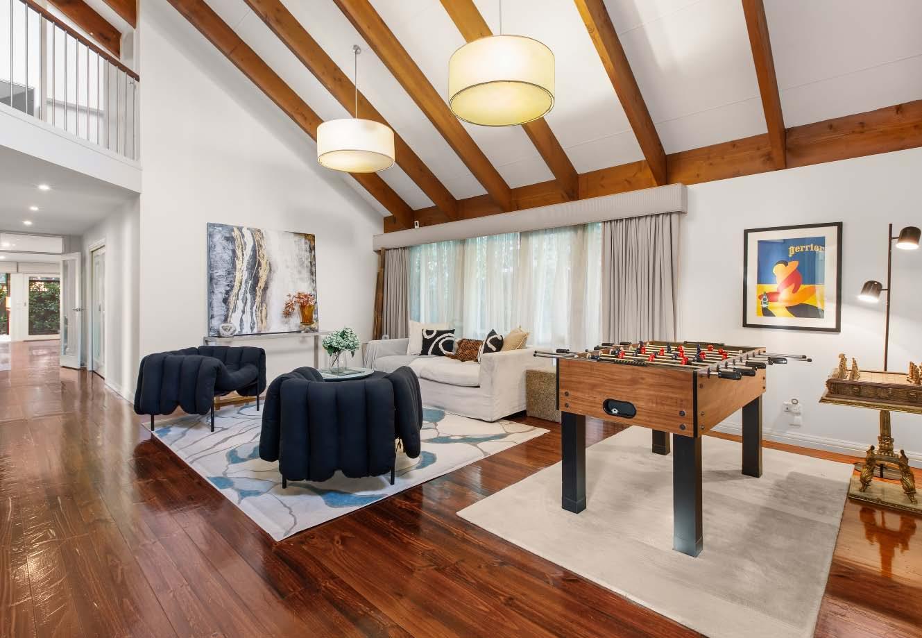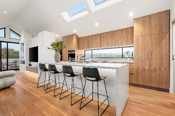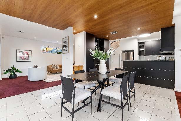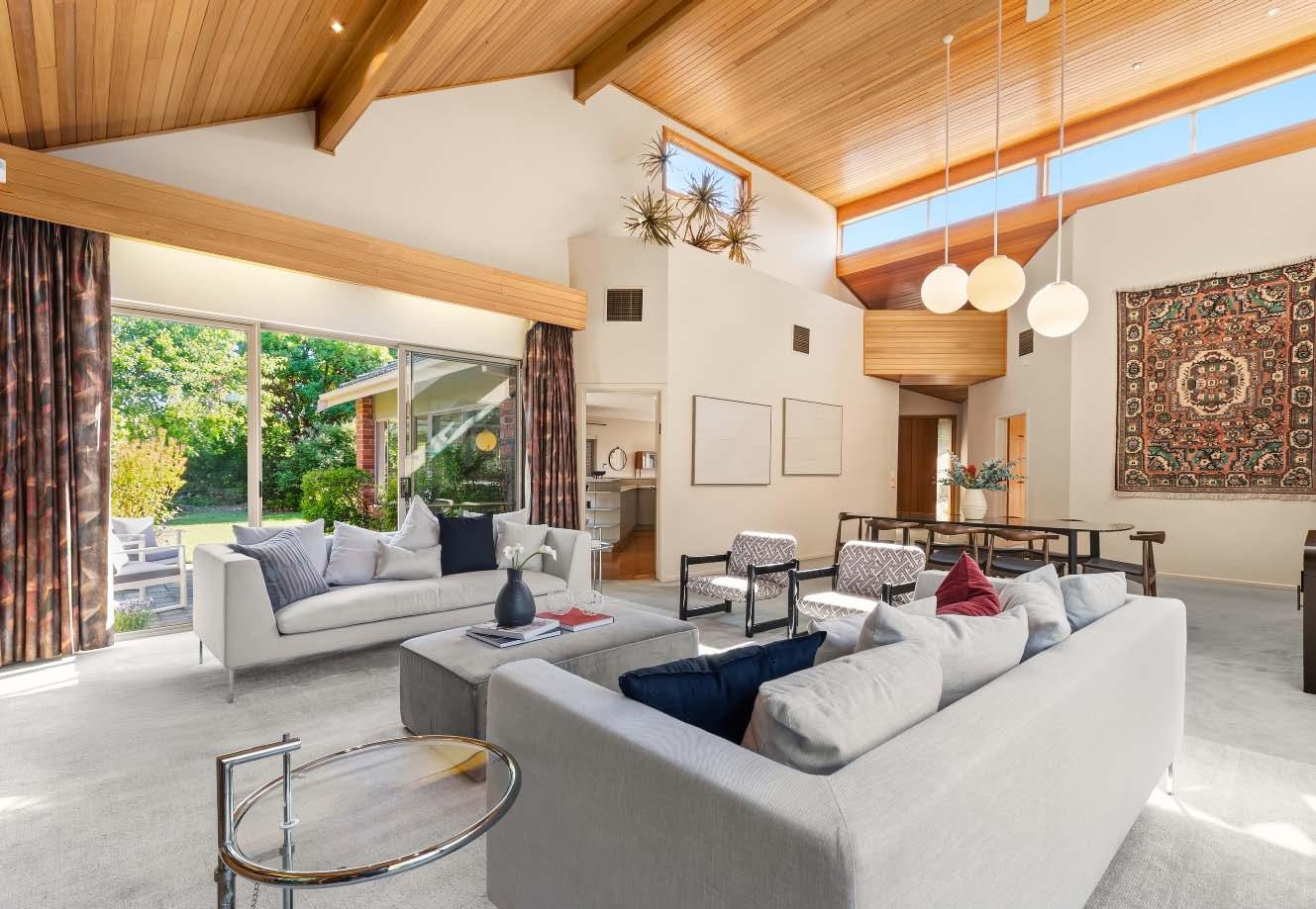 A living & dining connects seamlessly to the alfresco via two sets of glass French doors, revealing an expansive wrap-around deck with an entertainer’s dining zone & sunny northern aspect.