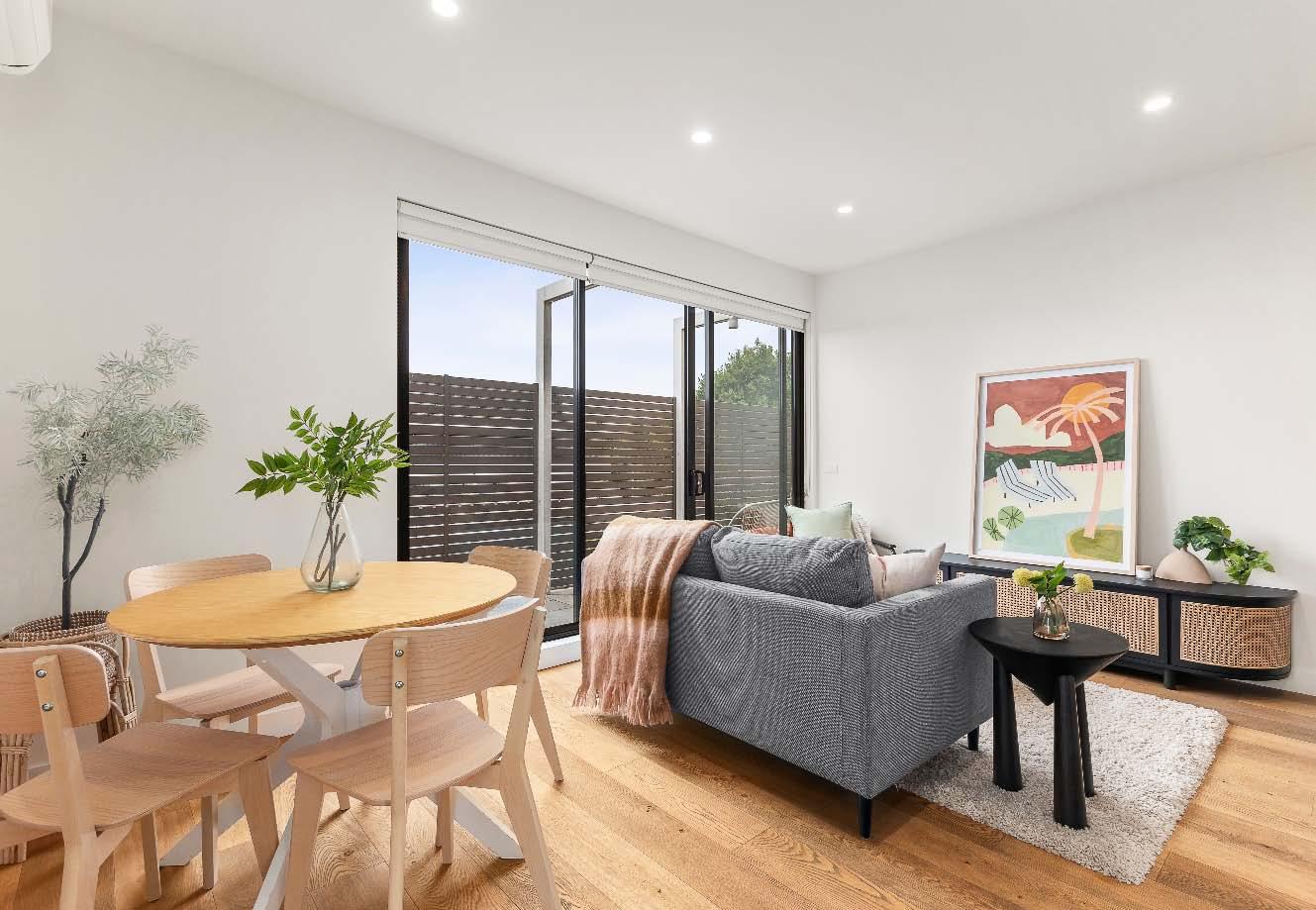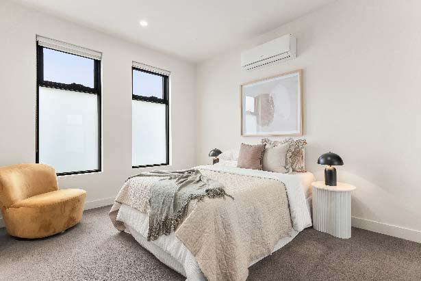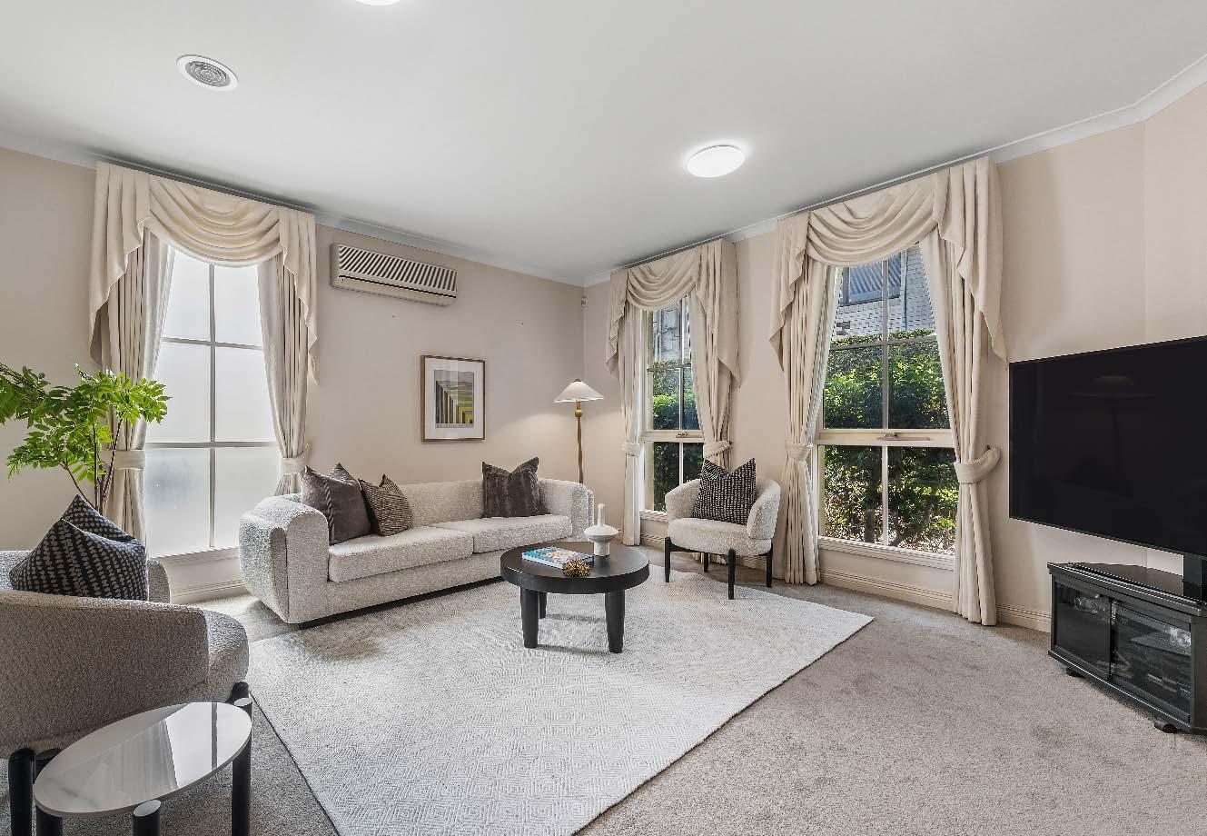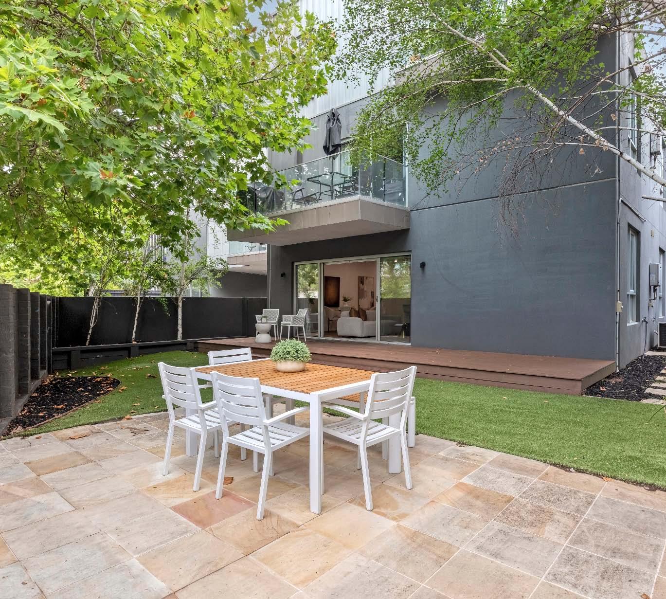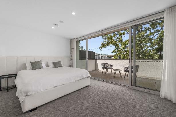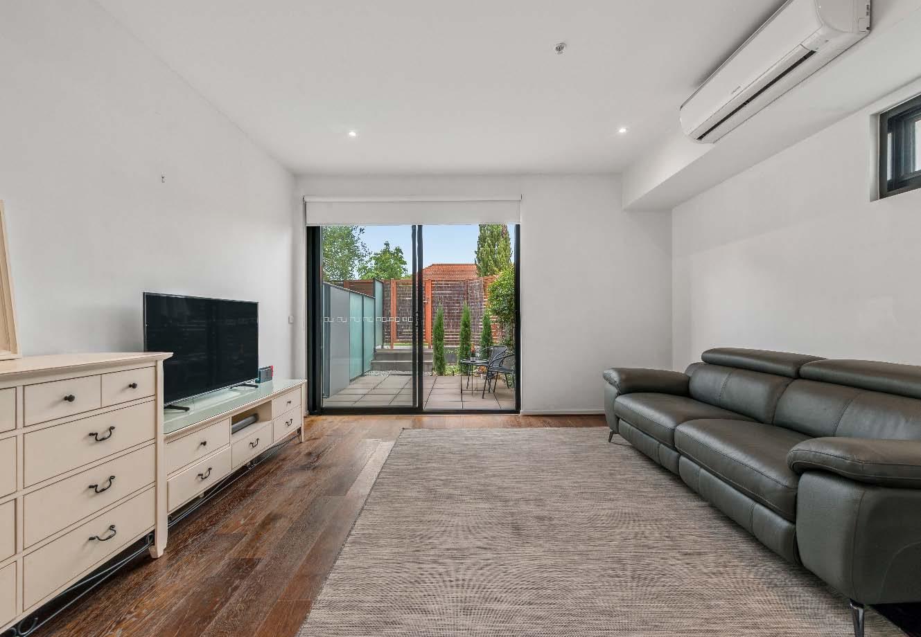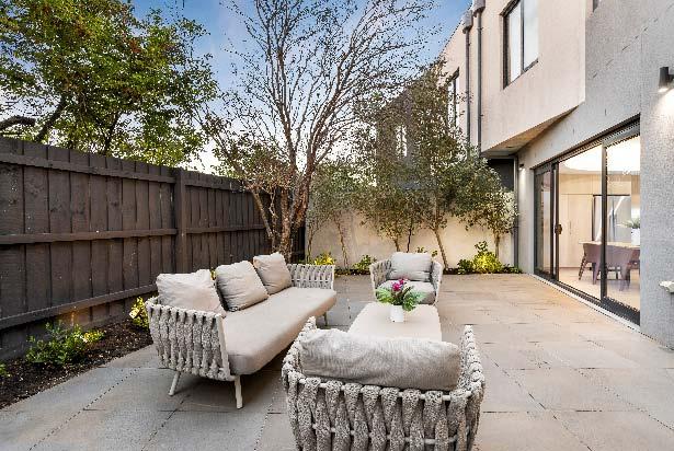 stone benchtops, an island bench & stainlesssteel appliances. Accommodation includes three bedrooms, two with built-in robes, the main enjoying an ensuite, while a beautifully finished central bathroom offers a rainfall shower & mirrored cabinetry. Additional highlights include a laundry with storage, a dedicated top-floor study, roller blinds & split-system heating/cooling throughout. A private terrace delivers the perfect setting for entertaining or unwinding, while secure undercover parking with remote access & internal entry completes this boutique offering within a tightly held complex of just six town residences.