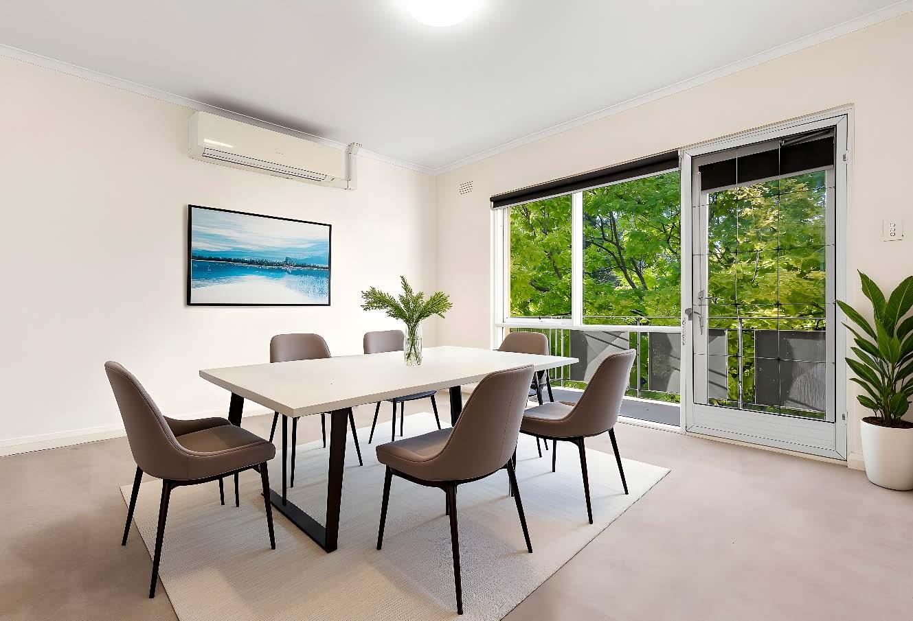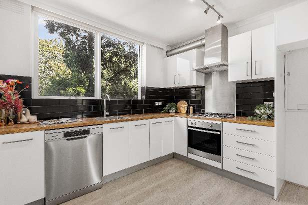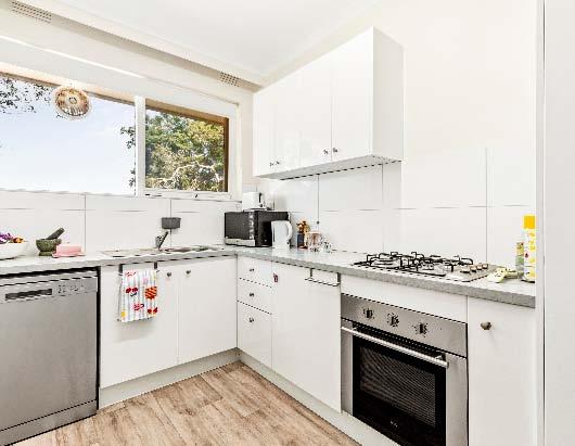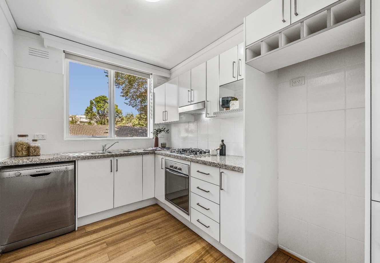 cooking, dishwasher & abundant storage, while the beautifully updated bathroom showcases quality stone finishes, full tiling & integrated laundry facilities, complemented by a separate toilet for added convenience. Both bedrooms feature built-in robes, wall heating, including a spacious main bedroom, providing outstanding accommodation rarely found in apartment living. Additional highlights include undercover off-street parking, reverse cycle heating / cooling in living room & the valuable bonus of a secure lock-up storeroom. A timeless solid-brick classic — they simply don’t build them like this anymore.