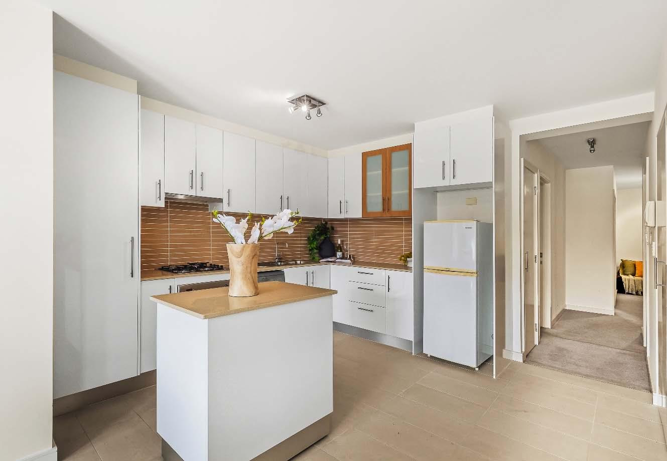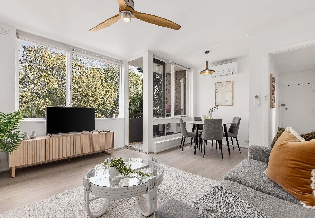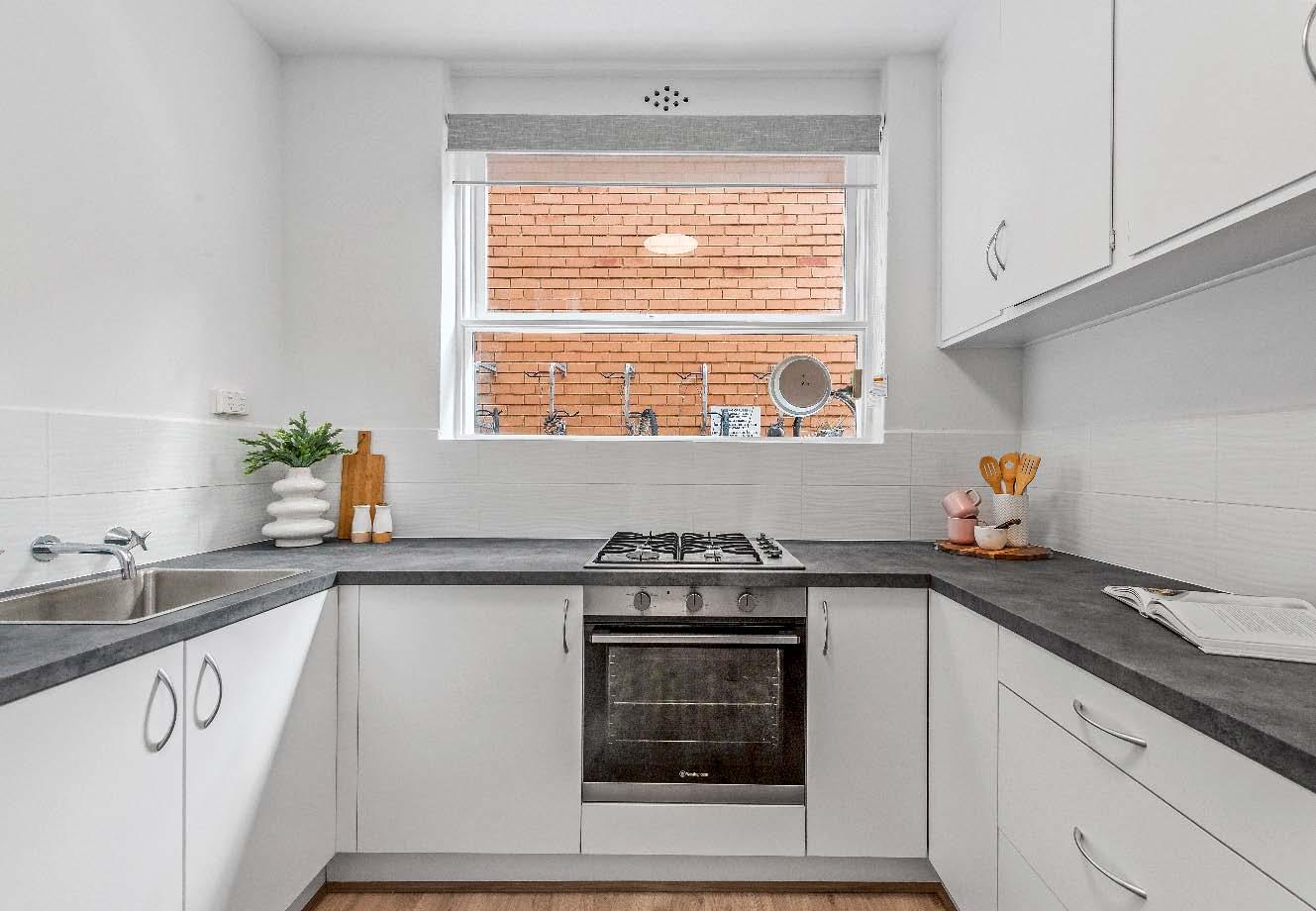 cooking, dishwasher & abundant storage, while the beautifully updated bathroom showcases quality stone finishes, full tiling & integrated laundry facilities, complemented by a separate toilet for added convenience. Both bedrooms feature built-in robes, wall heating, including a spacious main bedroom, providing outstanding accommodation rarely found in apartment living. Additional highlights include undercover off-street parking, reverse cycle heating / cooling in living room & the valuable bonus of a secure lock-up storeroom. A timeless solid-brick classic — they simply don’t build them like this anymore.