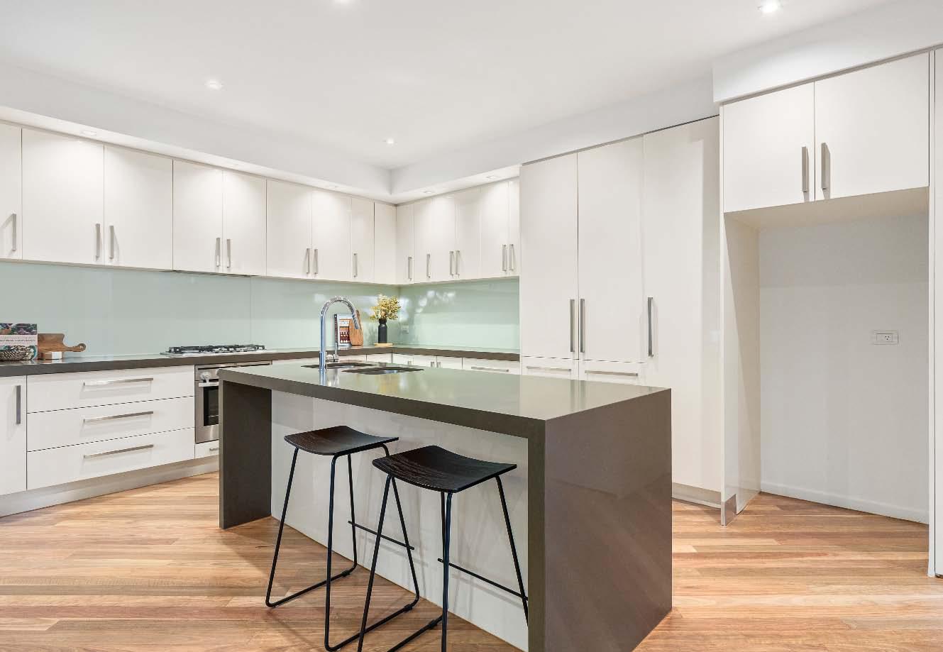 & beautifully crafted cabinetry. Thoughtfully designed for functionality, it also incorporates a cleverly concealed Euro laundry & a custom-fitted study desk, providing an ideal work-from-home space. Upstairs, two bedrooms fitted with built-in robes. These are serviced by a central bathroom & separate toilet. Occupying the entire top floor, the main bedroom retreat offers privacy & comfort, complete with a walk-through robe, electric blinds, ensuite & an expansive balcony terrace. Additional features include split-system heating & cooling, video intercom security & two secure basement car spaces with storage.