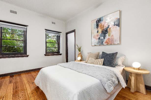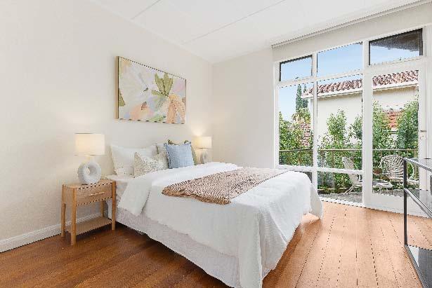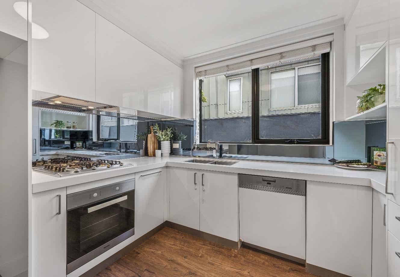 cornices & elegant curves synonymous with the Art Deco era. Adding to the appeal is a well appointed stone kitchen with quality appliances (including integrated dishwasher), good storage, space for meals area, a Euro laundry & access to a small privately enclosed balcony. Also featuring a good sized main bedroom with built-in robes & a sun-drenched private balcony, a second bedroom with leafy outlooks & a modern fully tiled central bathroom. Other features include polished timber floors throughout, split system heating/cooling, secure intercom entry & secure off street parking for one car.