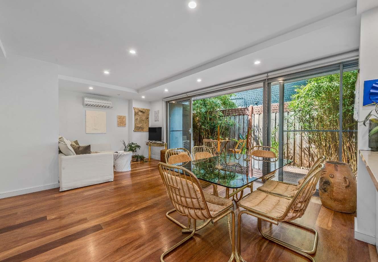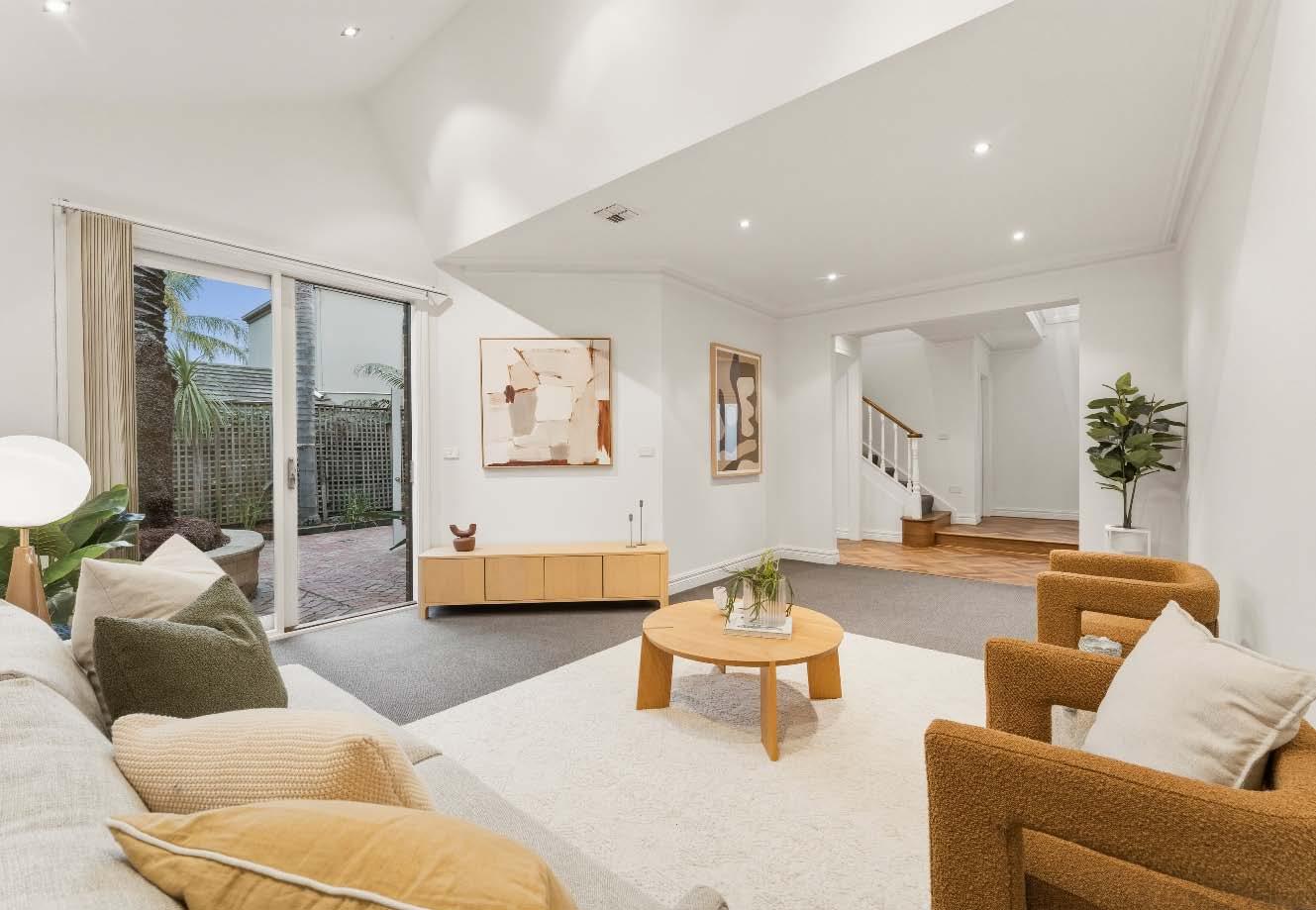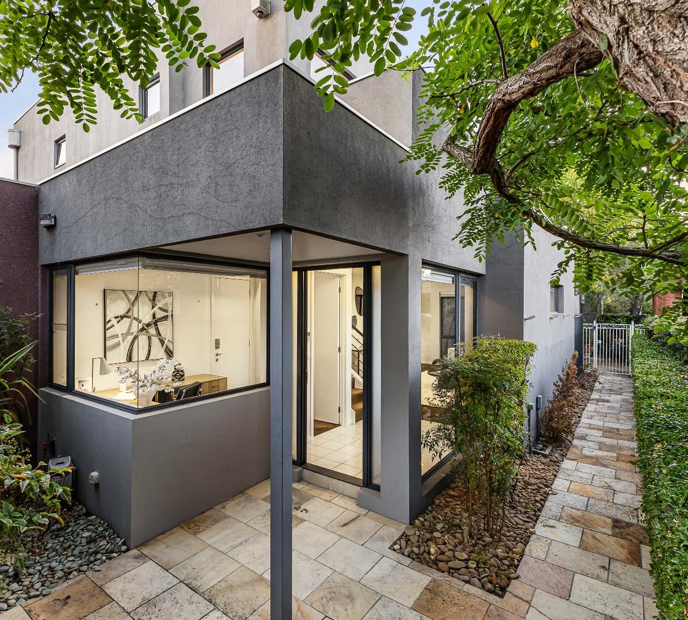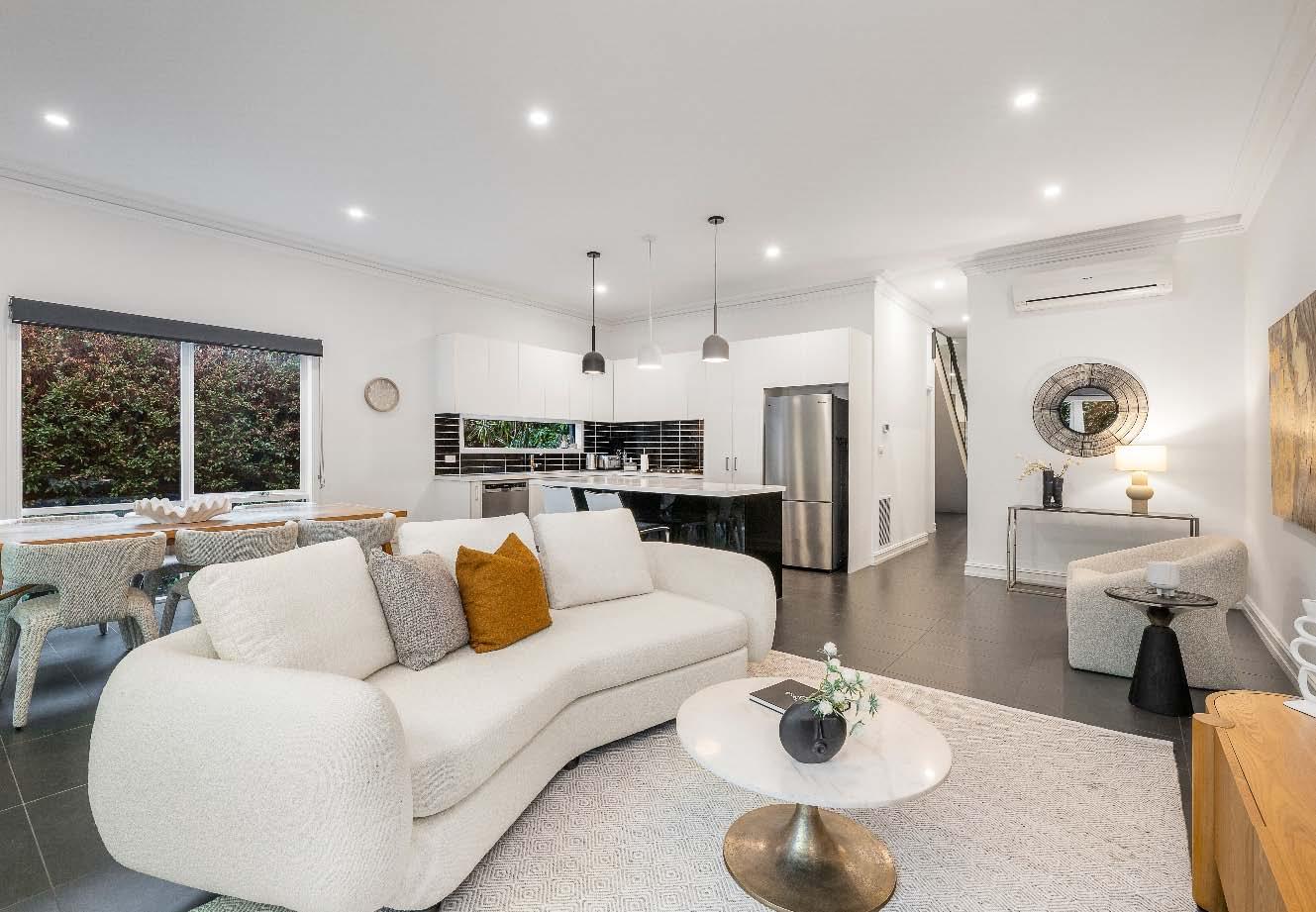 Near-new & architecturally designed, this exceptional townhouse redefines modern living with a rare sense of space, privacy & individuality. Cleverly conceived with an edge-to-edge design & no outlooks into boundary fencing, it delivers the look & feel of a standalone home — a standout in its class. High specifications are evident throughout, with natural stone finishes, recycled brick features, solid surface basins & bathware & timber flooring flowing seamlessly across both ground & first levels. The thoughtfully designed floorplan includes a purpose-built study & a striking sunken lounge — an inspired architectural
