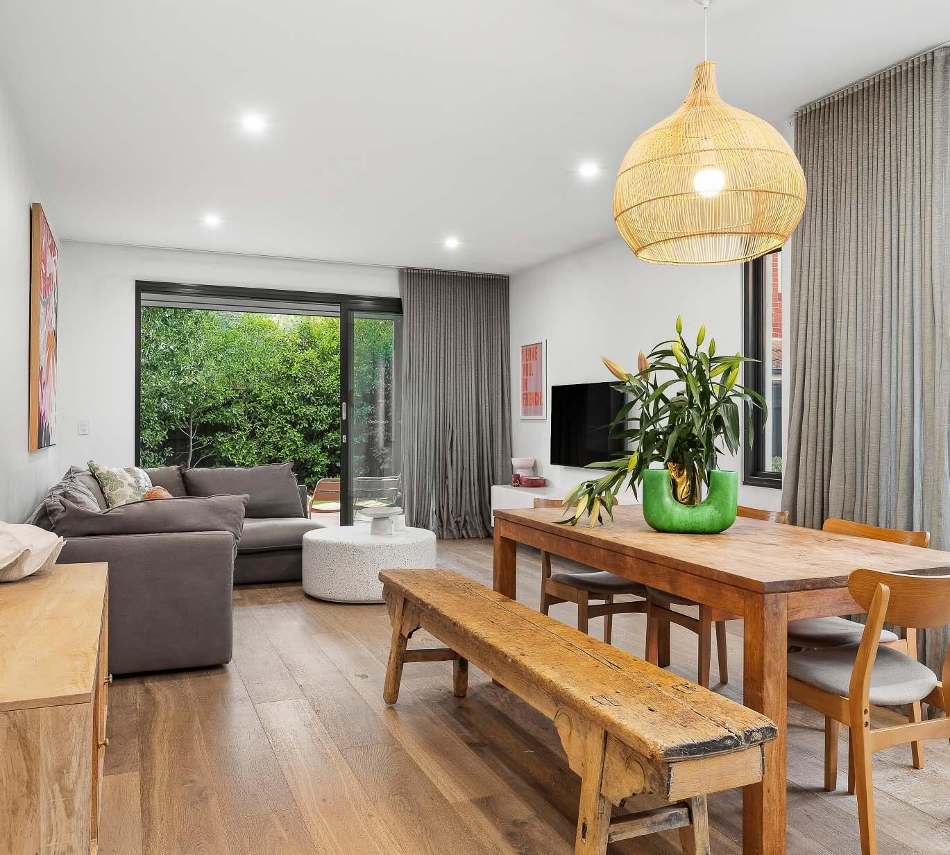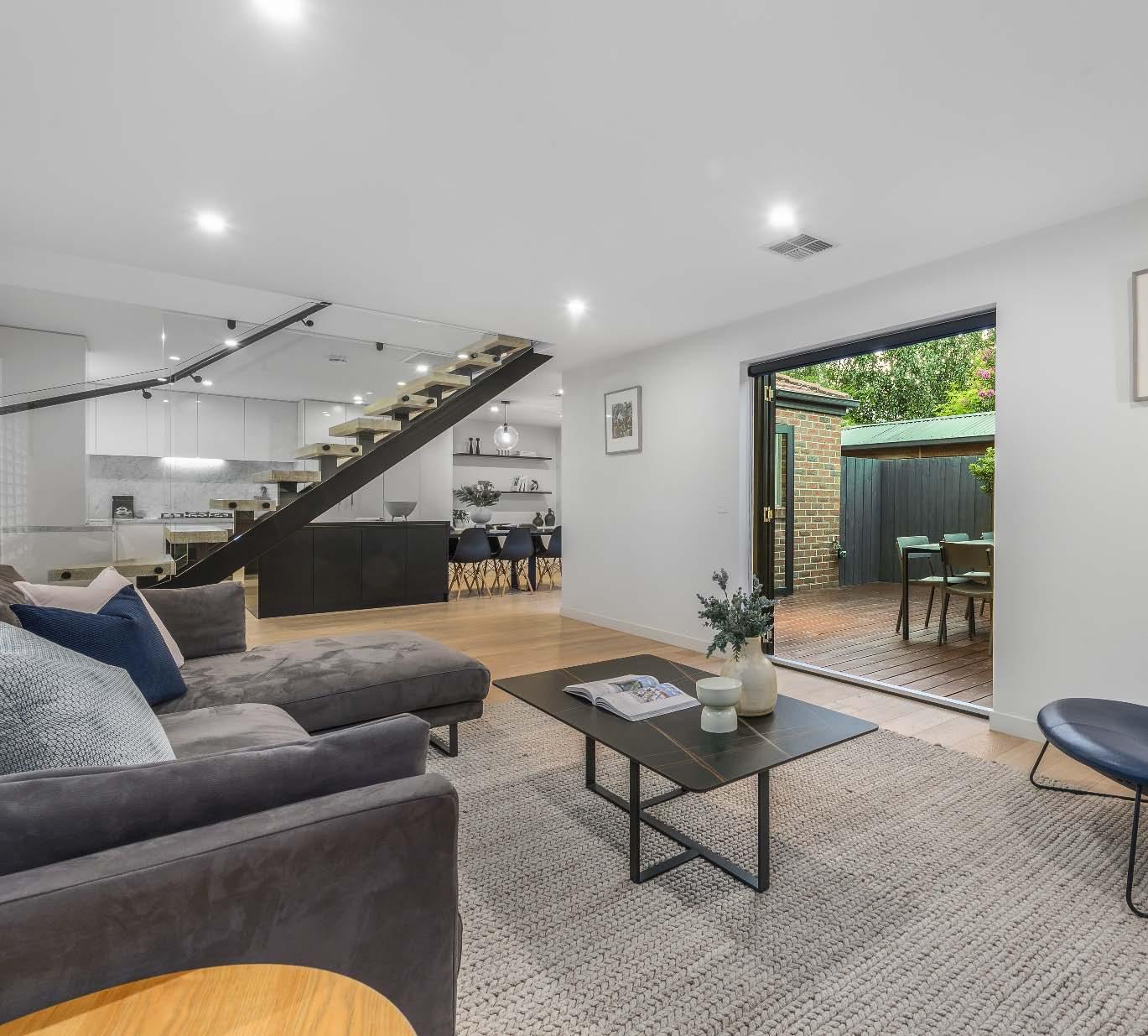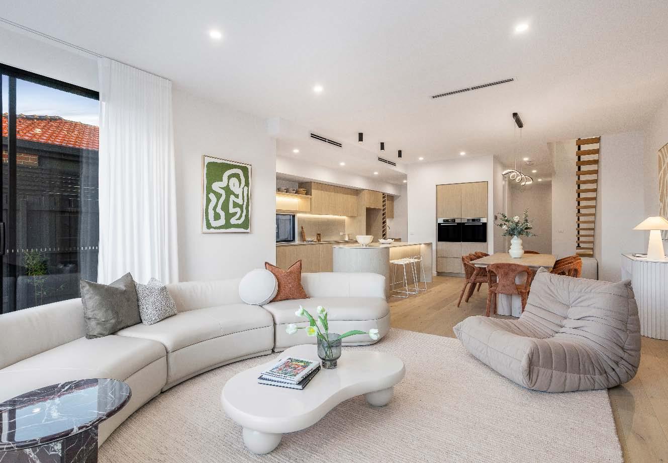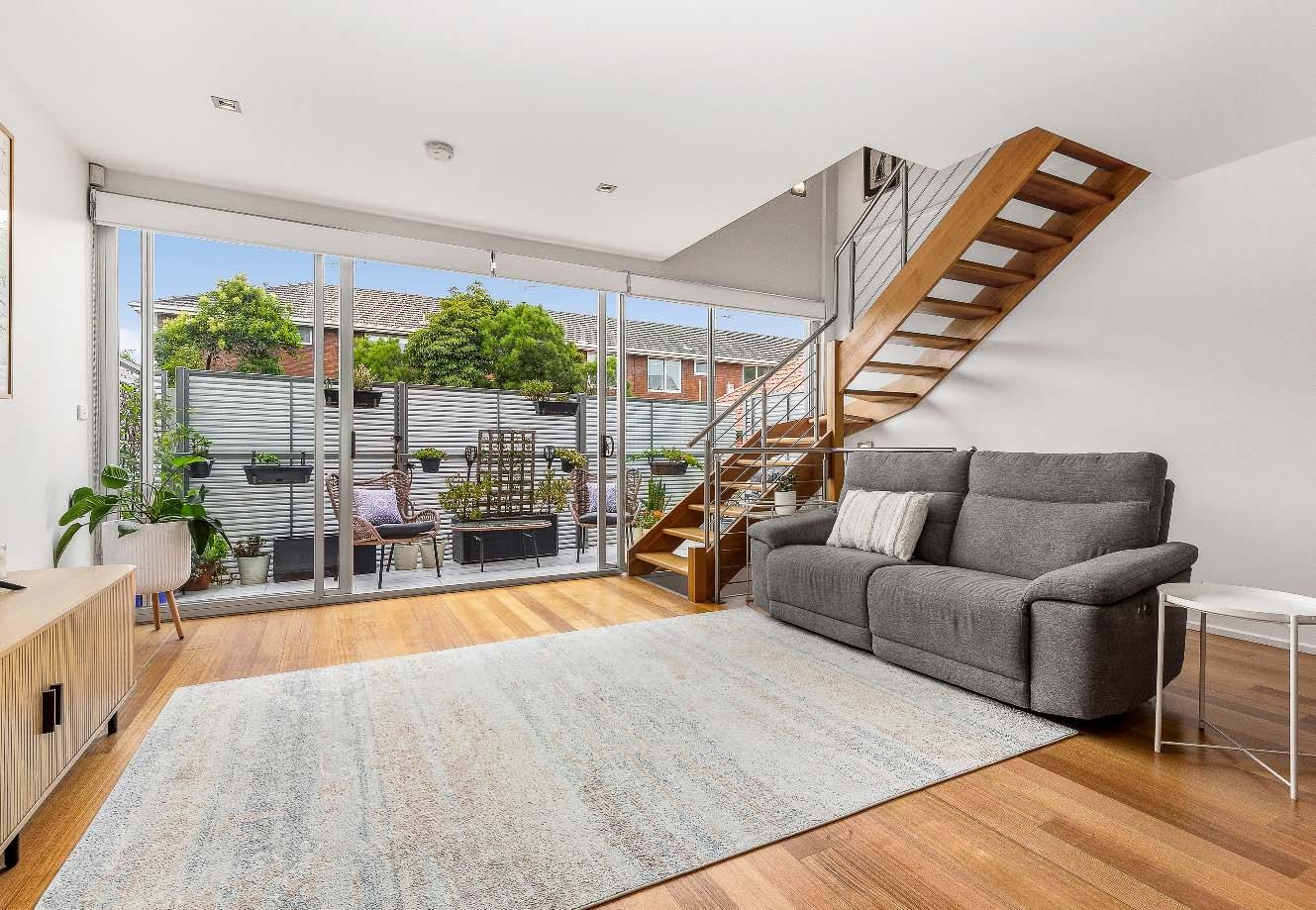 Near-new & architecturally designed, this exceptional townhouse redefines modern living with a rare sense of space, privacy & individuality. Cleverly conceived with an edge-to-edge design & no outlooks into boundary fencing, it delivers the look & feel of a standalone home — a standout in its class. High specifications are evident throughout, with natural stone finishes, recycled brick features, solid surface basins & bathware & timber flooring flowing seamlessly across both ground & first levels. The thoughtfully designed floorplan includes a purpose-built study & a striking sunken lounge — an inspired architectural