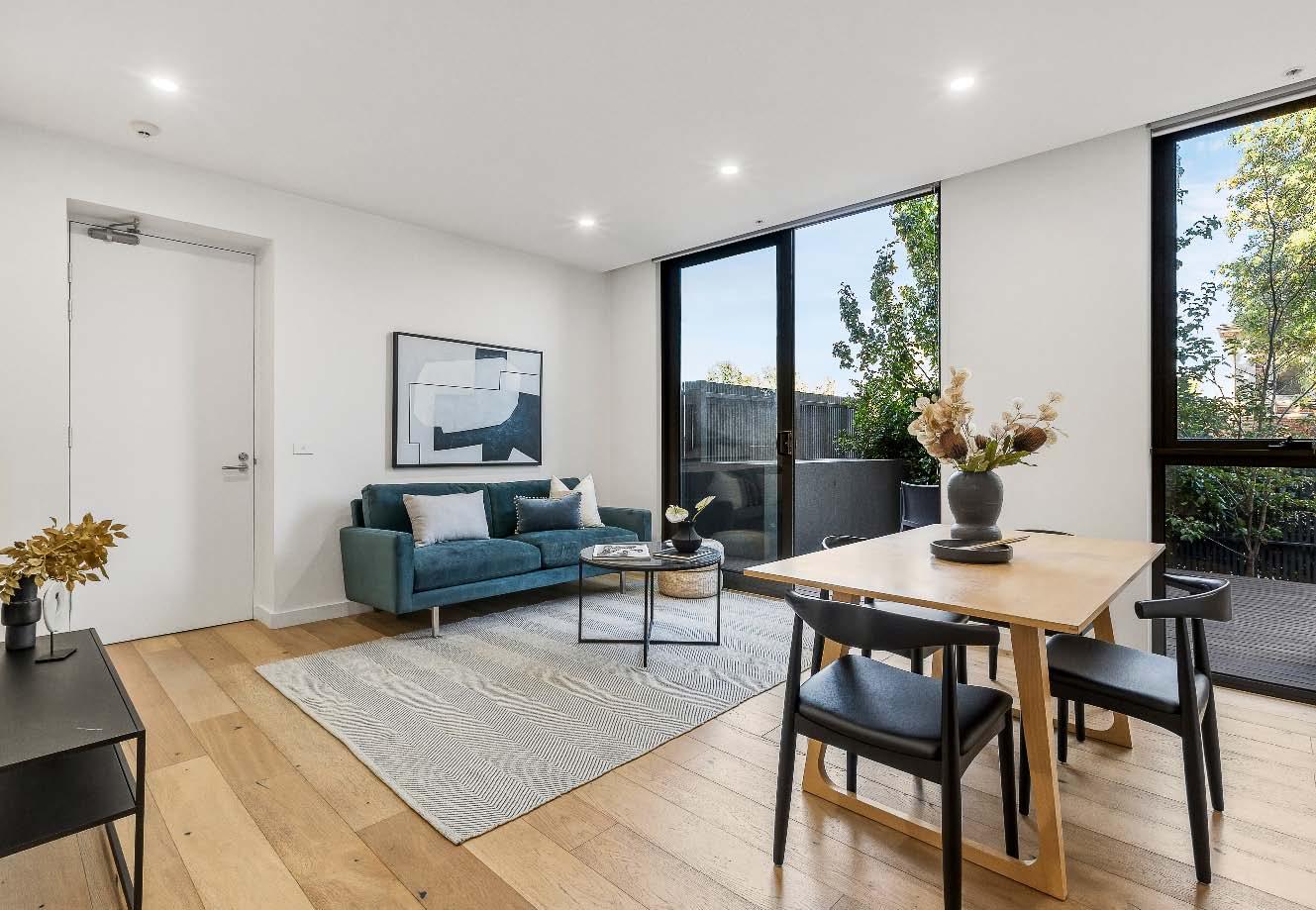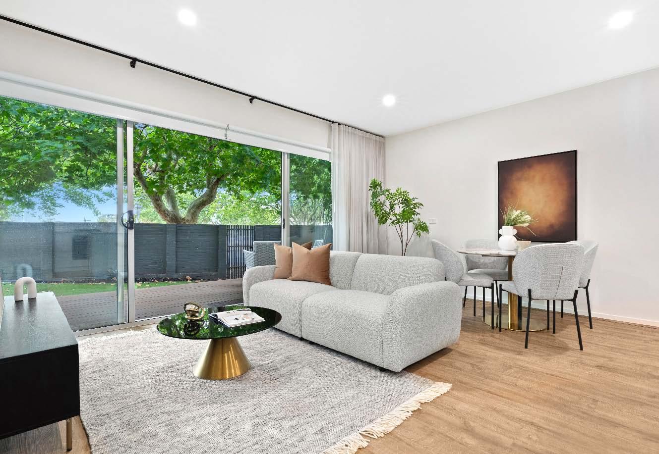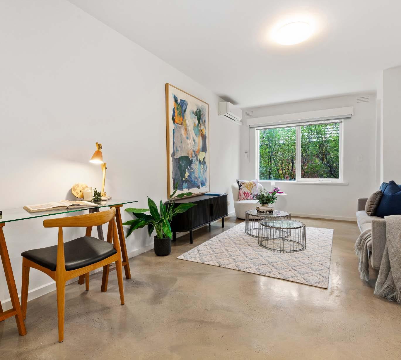 Set within a boutique solid-brick building of only seven, this elevated ground floor apartment delivers the space, solid construction & lifestyle convenience that buyers are always searching for. Built to last with solid brick & concrete construction, this is a home where size, durability & comfort come together effortlessly. With stunning polished concrete floors & filled with natural light, the generous living & dining domain opens to a private balcony overlooking leafy greenery — a peaceful setting perfect for everyday living or relaxed entertaining. The fully renovated kitchen impresses with stone benchtops, gas