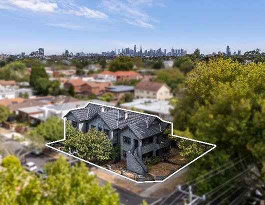 windows, elegant arched entrance hallways, picture rails, timber flooring & leafy outlooks. All six apartments, three on the ground level & three above, each with its own private entry, deliver large living & adjoining dining rooms, separate kitchens, central bathrooms & one/two well-sized bedrooms. Some apartments have been enhanced with split system heating/cooling & updated kitchens & bathrooms, while the one-bedroom residences also feature versatile sunrooms, ideal as study zones or additional living spaces. The property also features two lock-up garages. *Approximate Title Dimensions.