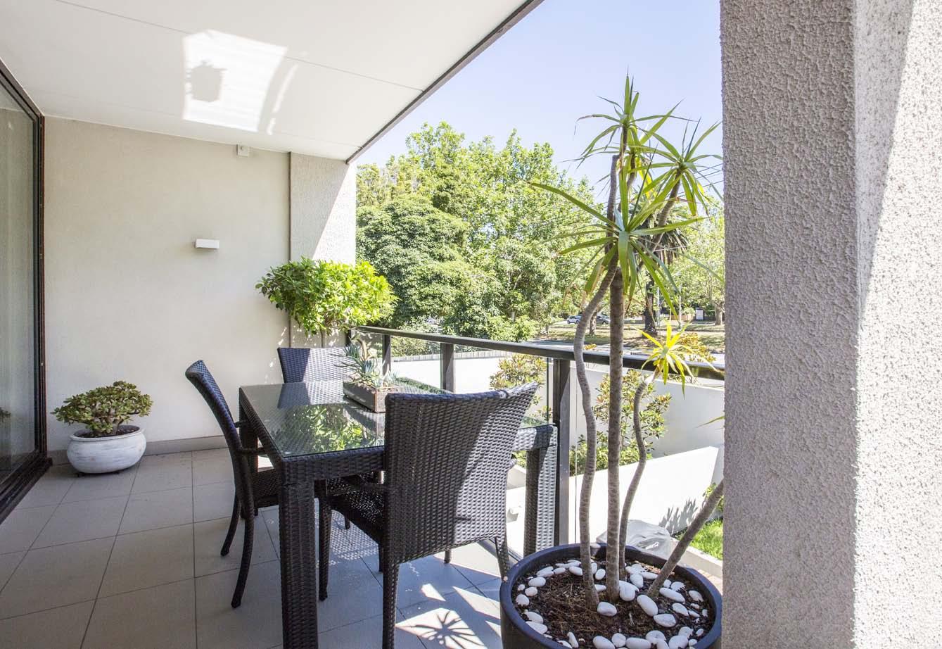 space outdoors, a full-width balcony terrace with lovely leafy views provides a wonderful setting for indoor-outdoor living & entertaining. The apartment also delivers two good sized carpeted bedrooms with mirrored built-in robes, including a stylish ensuite to the main bedroom, along with a second sparkling central bathroom with shower over bath. Additional features include split system heating/cooling, panel wall heaters in the bedrooms, Euro laundry, video intercom entry, secure basement parking & a storage cage.