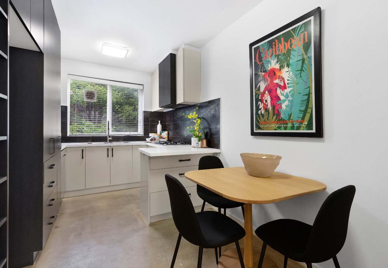 centred around an open fireplace & lined with picture-frame sash windows. The well-appointed kitchen, complete with island bench, overlooks a defined dining area, serviced by an adjacent powder room. The oversized bedroom is bathed in natural light via north-west windows & features new carpeting & extensive built-in robes, alongside a stylish ensuite showcasing exposed brickwork & louvre windows. Complete with a panel heater in the bedroom, split-system in the dining & secure intercom-monitored entry, this turnkey ground-floor residence places you in the heart of spectacular St Kilda.