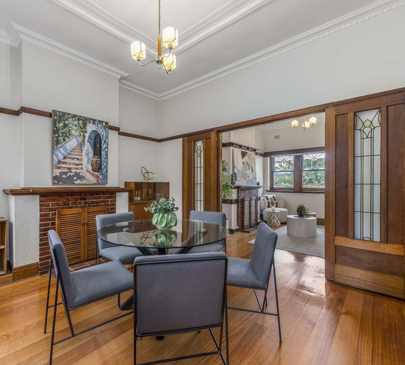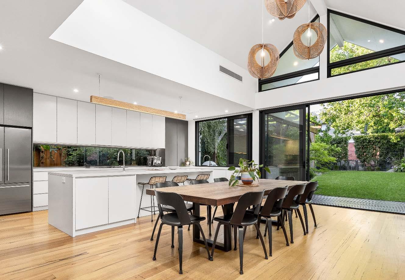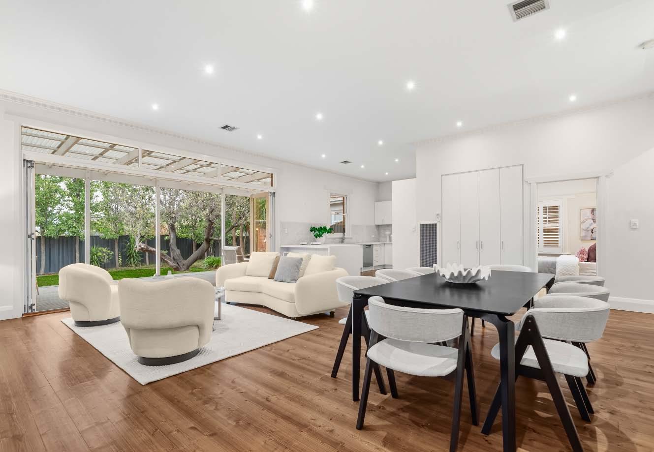 A captivating period façade, magnificent front garden & a contemporary renovation, sets the scene for this breathtaking entertainer’s dream, positioned on a 993m2* allotment. From the moment you step inside the wide entrance hallway, the craftsmanship & timeless period detail are immediately apparent. The original front section of the home introduces a main bedroom with ensuite, while three additional bedrooms share a central bathroom. A large formal dining room flows through to the spectacular heart of the home – an open plan northerly oriented living & dining zone with soaring 3.6m ceilings & custom