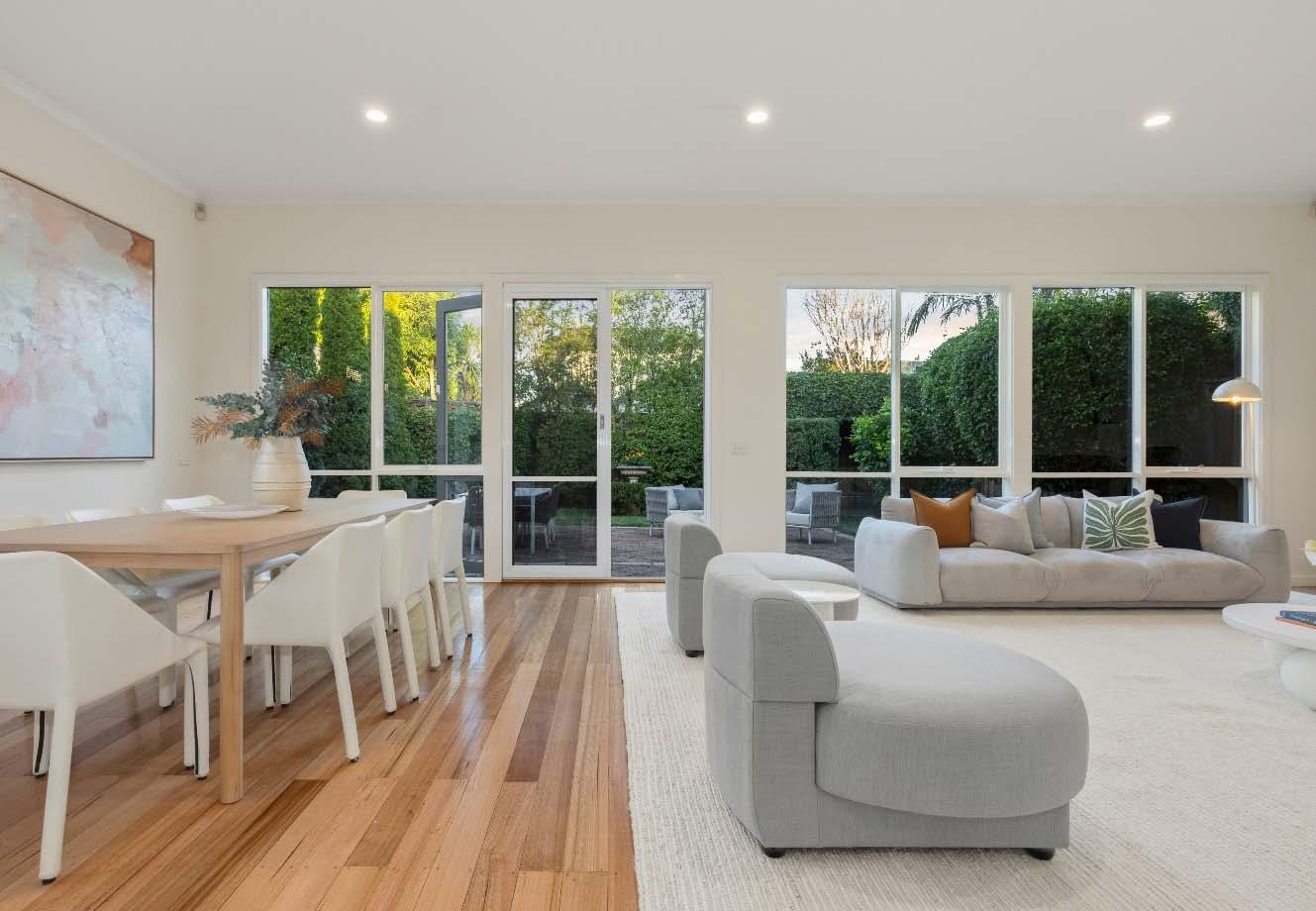 Timber flooring flows from the entrance hallway with abundant storage through to a wonderfully expansive open-plan living & dining zone. Wrapped in full height glass windows & sliding doors, this space opens out to a privately enclosed rear courtyard with leafy surrounds, ideal for alfresco relaxing & entertaining. Adding to the appeal is a