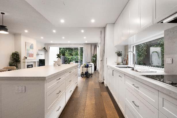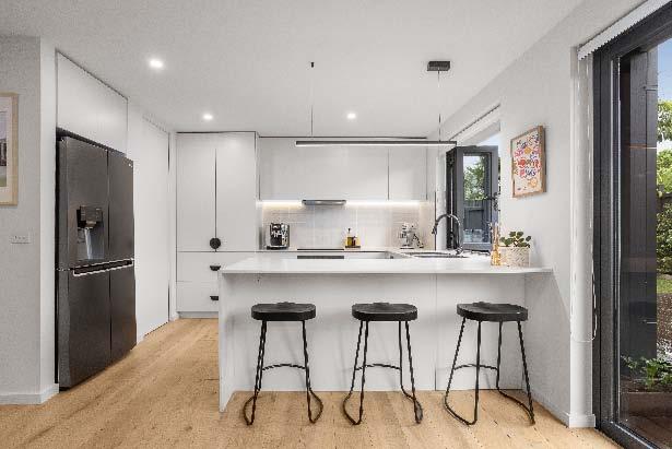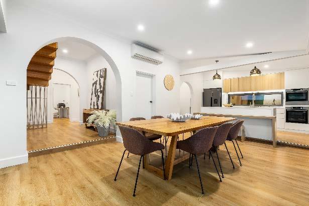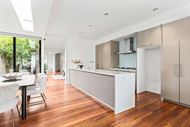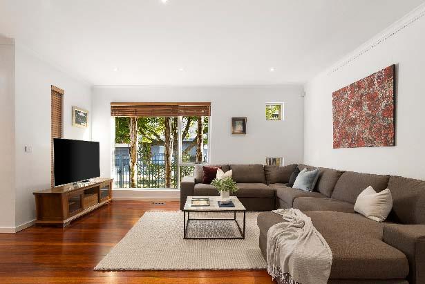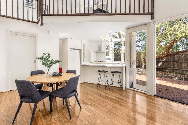 zone highlighted by lofty slanted ceilings with light capturing clerestory windows. Bi-fold doors extend outdoors to a rear courtyard. The adjoining timber & stone kitchen impresses with its walk-in pantry & abundant storage. Upstairs, natural light continues to shine through a custom fitted landing retreat – an ideal home office or study space with built-in desk & cabinetry. Two spacious bedrooms with built-in robes, share a central bathroom & separate toilet. Additional features include hydronic heating, split system heating/cooling, a powder room, separate laundry, under stair storage & ceiling fans.