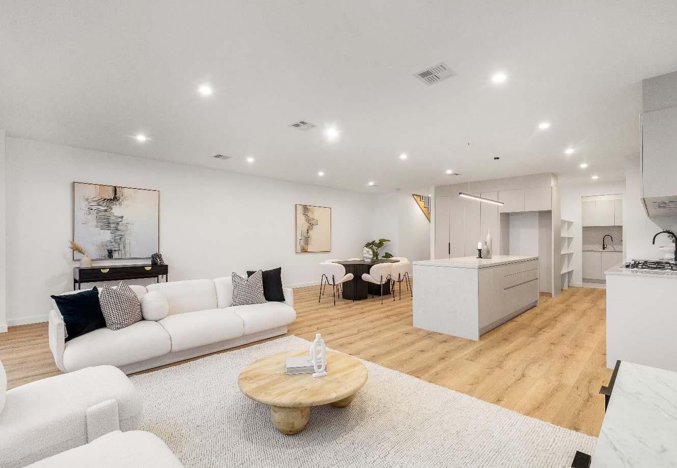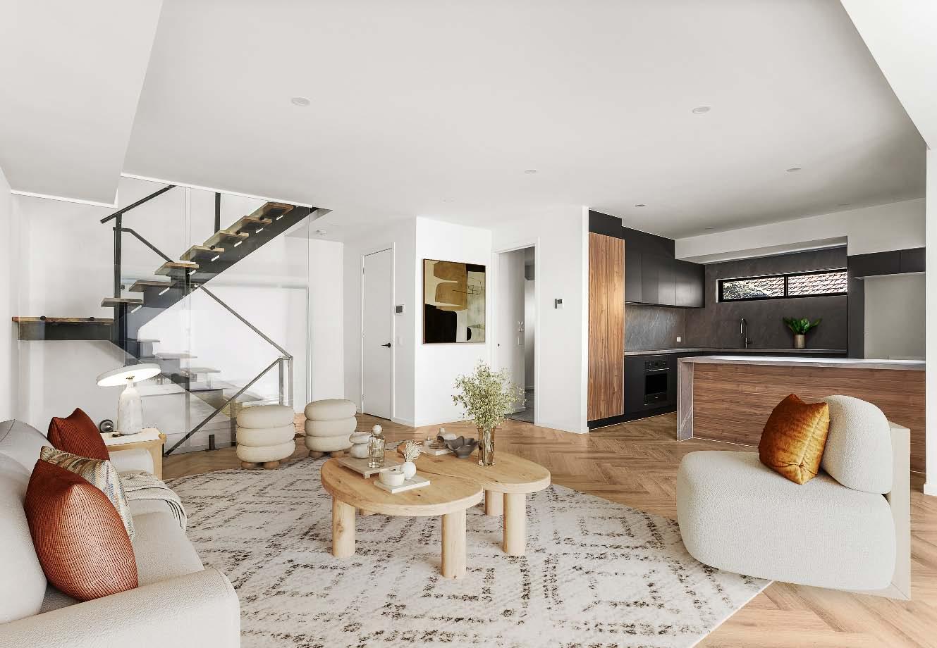 A brand new, architecturally designed town residence in an exclusive boutique development, this home showcases inspired design & flawless finishes at every turn. Tucked away in a cul-de-sac yet perfectly positioned for lifestyle convenience, it delivers the very best in contemporary living –complete with the added benefit of its own private street entrance. Superb engineered Chevron parquetry flows throughout the elevated open plan living & dining zone, where stacker sliding doors open to an expansive balcony terrace – the perfect setting for alfresco relaxing & entertaining while soaking in tranquil views. This light filled space is