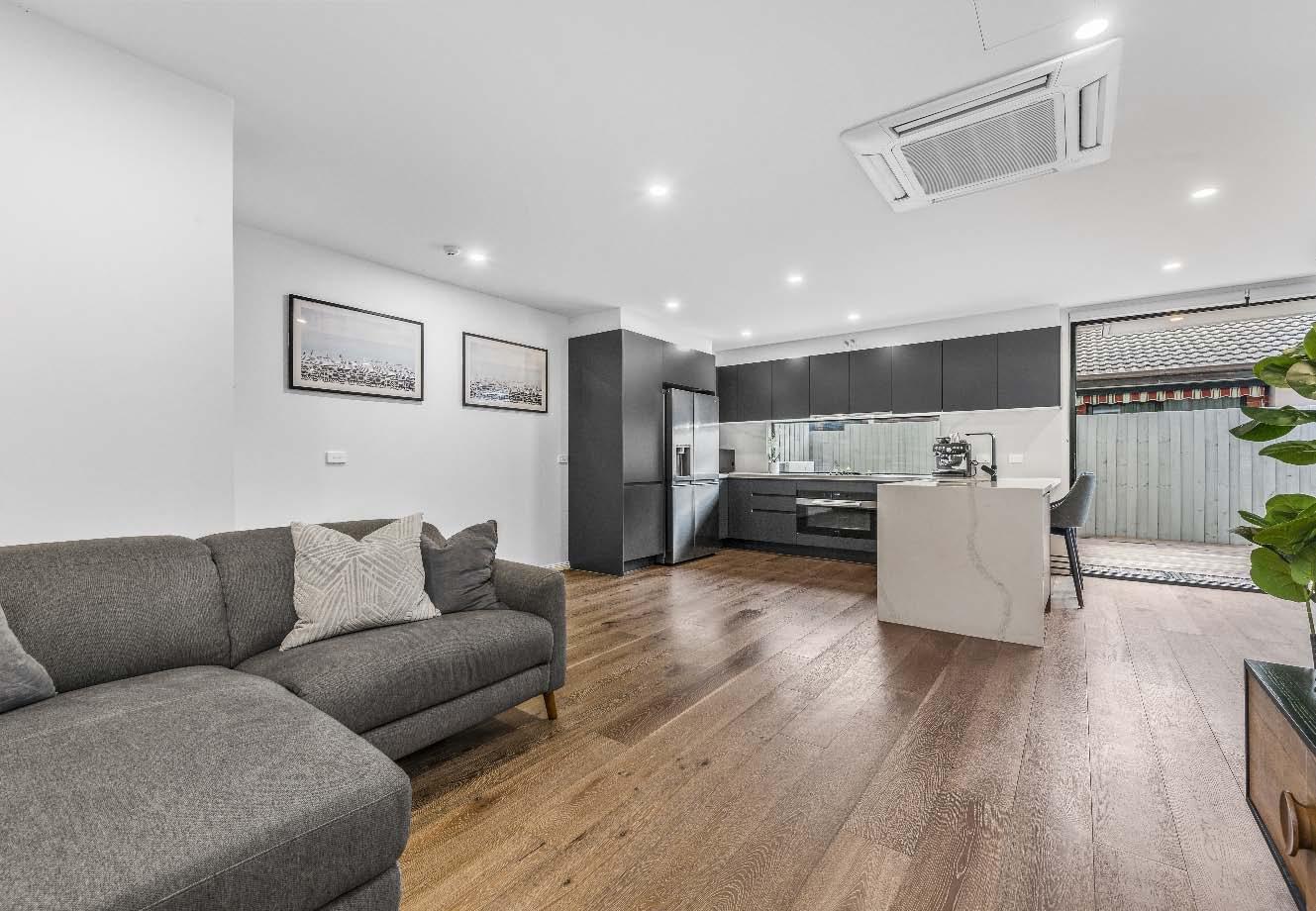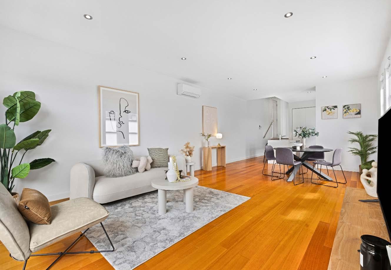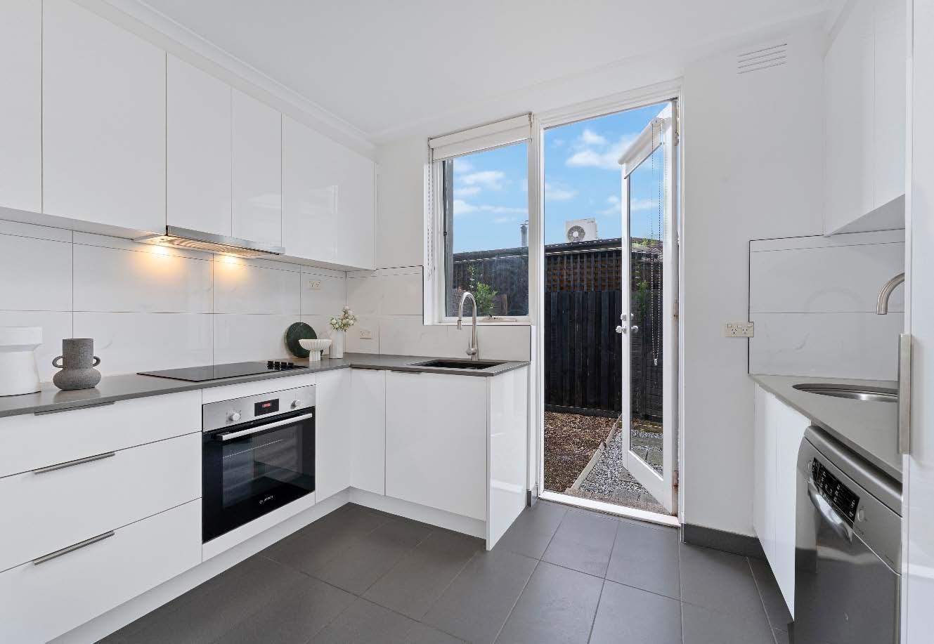 Securely tucked away near the rear of a gated complex, this stylish townhouse with fabulous alfresco appeal delivers the perfect blend of peace, privacy & lifestyle convenience in the heart of St Kilda East. Whether you’re a first home buyer looking to make your mark or a savvy investor, this light filled home ticks all the boxes. Timber floors beneath a striking skylit void welcome you & flow through to a northerly oriented open plan living & dining zone, complemented by a neatly presented kitchen with good storage & a Euro laundry. Full height industrial Rylock sliding doors reveal a generous wraparound courtyard