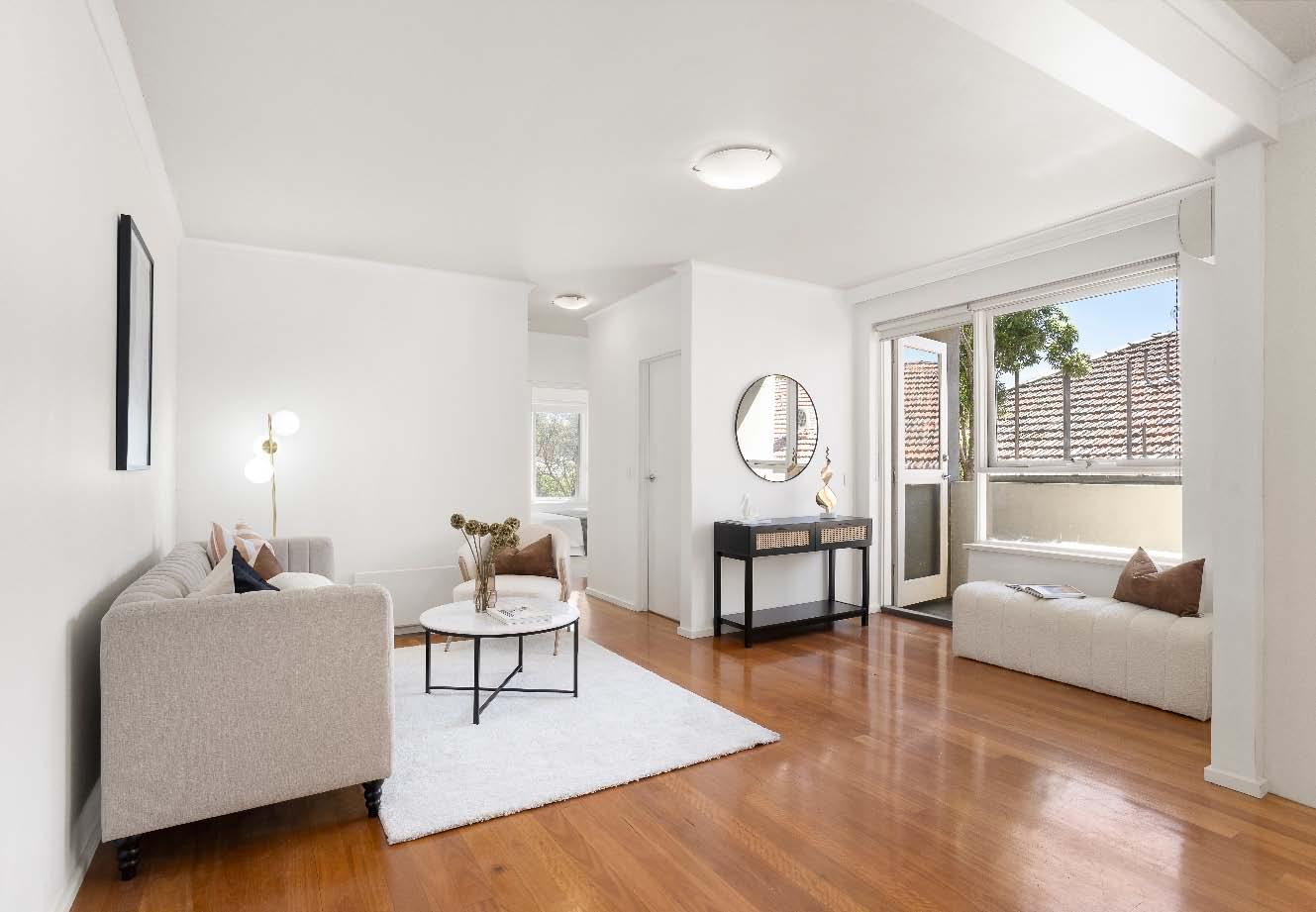 views of picturesque plane-tree-lined Alma Road. A separate kitchen & meals is well equipped with updated stainless-steel wall oven, dishwasher & integrated gas cooktop. Two inviting bedrooms are lined with polished parquetry flooring & built-in robes, sharing a central bathroom with separate powder room. A separate laundry with access to a second balcony, ducted heating & cooling, secure intercom-monitored entry & undercover off-street parking complete this unique inner-city gem.