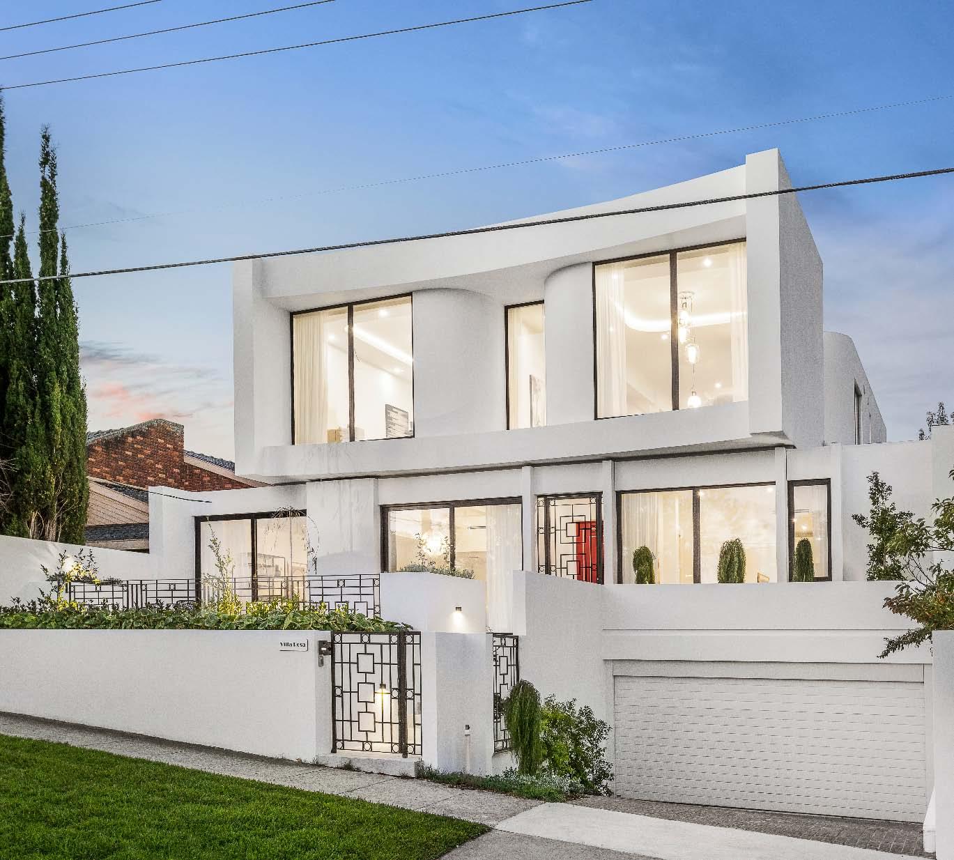 pool, built-in BBQ, a sauna & surrounding decks & terrace. Overlooking an internal courtyard, the sleek gourmet kitchen is appointed with stone benches & Smeg appliances. The main bedroom with walk-in robe & designer en suite is set apart from a fabulous children’s zone comprising a second bedroom with chic en suite & built-in robe, three additional robed bedrooms, a retreat, study & stylish bathroom. Desirably situated close to Glen Huntly station & trams, it includes video intercom, ducted heating/cooling, reverse cycle air-conditioner, audio-wiring, solar panels & garage.