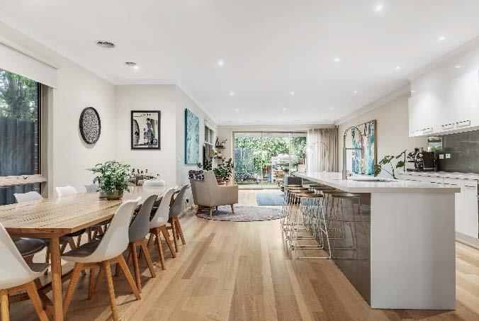 beautiful decorative ceilings & complemented by a modern central bathroom & a cleverly integrated Euro laundry. The hallway culminates in the heart of the home – a naturally light filled open plan living & dining with built-in cabinetry. Here two sets of doors extend out to a full width deck & enclosed rear garden. Adding to the allure, a gourmet stone kitchen entices with an oversized central island bench, stainless steel appliances & an abundance of storage. Other features include hydronic heating, air conditioning, single garage/ storage space & off street parking in driveway.