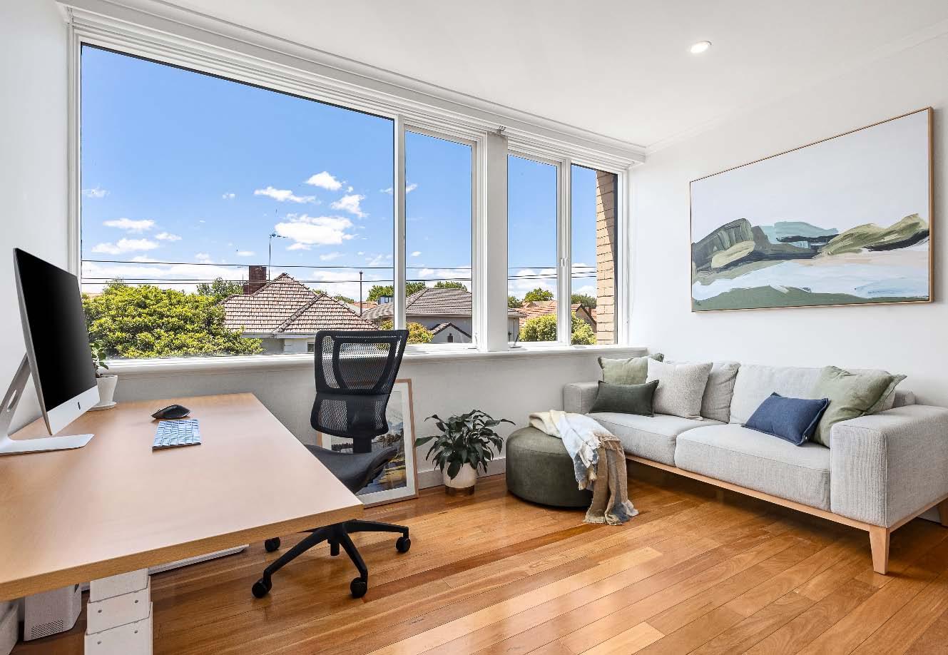 built-in robes, are serviced by a main bathroom with shower-over-bath, while the home’s primary bedroom enjoys a private ensuite & built-in robe. A European laundry, study nook & generous storage throughout complete the internal floorplan, while split systems, energy efficient fans, Euro slim fit heating panels, newly updated wiring, TV-monitored intercom & basement parking & storage room make for everyday-living convenience. Immediately appealing while also offering scope to update in the future, it’s just a short walk to Alma Village, Carlisle Street, plus vibrant Chapel Street minutes away.