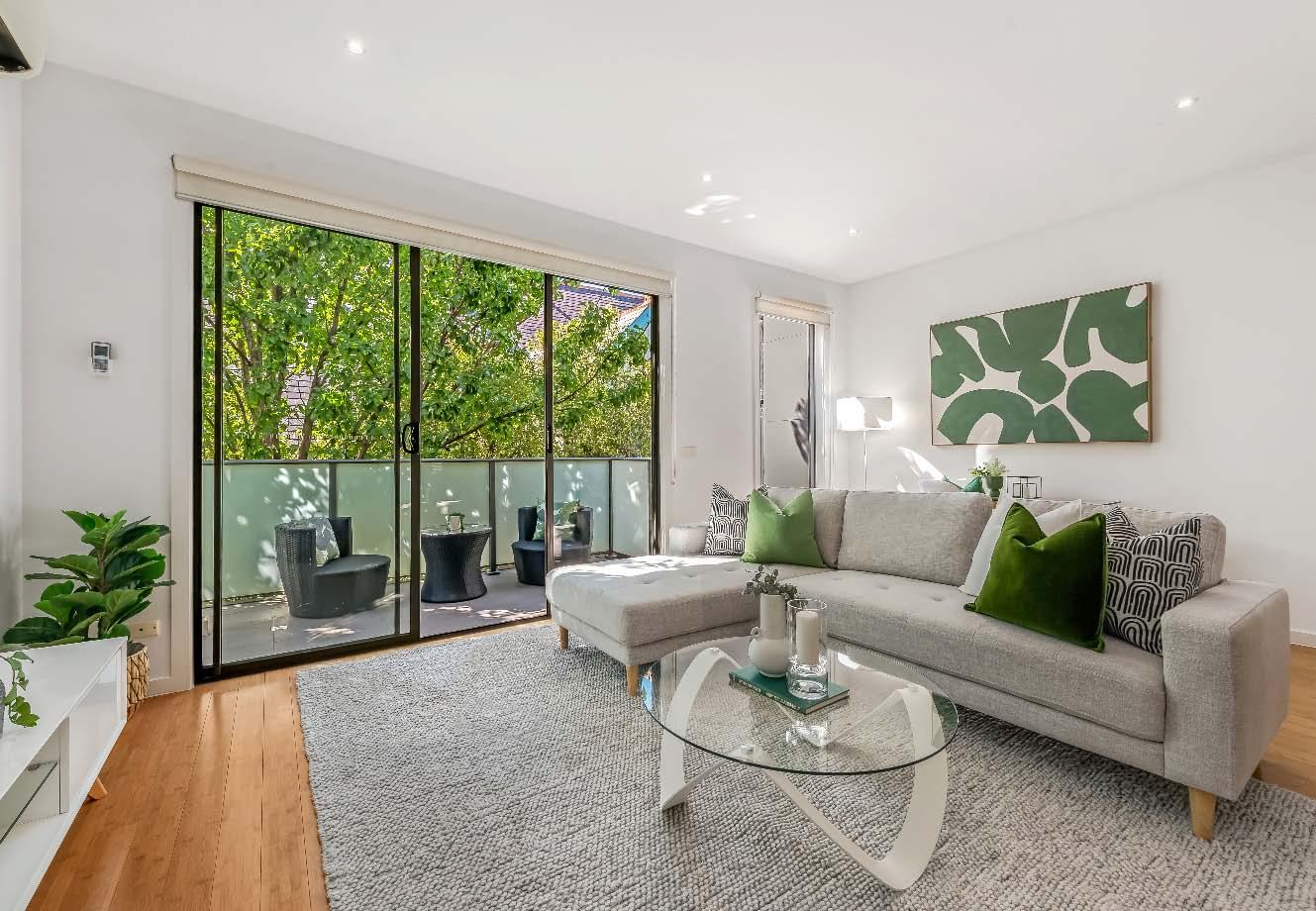 With secure entry off Hotham Grove & convenient lift access to the first level “Indigo of Ripponlea” presents a high standard of living in a wonderful lifestyle location. Whether you’re looking to enter the property market or for a future proof investment, this contemporary apartment in an architecturally designed boutique block is sure to impress. An open plan living & dining zone with timber flooring & leafy outlooks greets you on arrival & enjoys access to a covered balcony terrace, the ideal spot for alfresco relaxing & entertaining. This light filled living space is served by a well appointed galley style stone kitchen with
