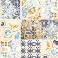 A tablecloth that recalls the art of patchwork in small squares, alternates full colors with traditional geometric designs and abstract floral motifs.